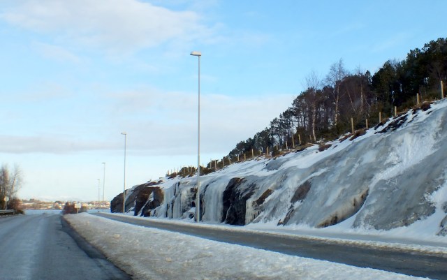 From there, we proceeded to some of the islands that make up Stavanger.  We drove through a 6 km long tunnel underwater, then across a tiny island and a bridge to Mosterøy. There were frozen water falls along the road.