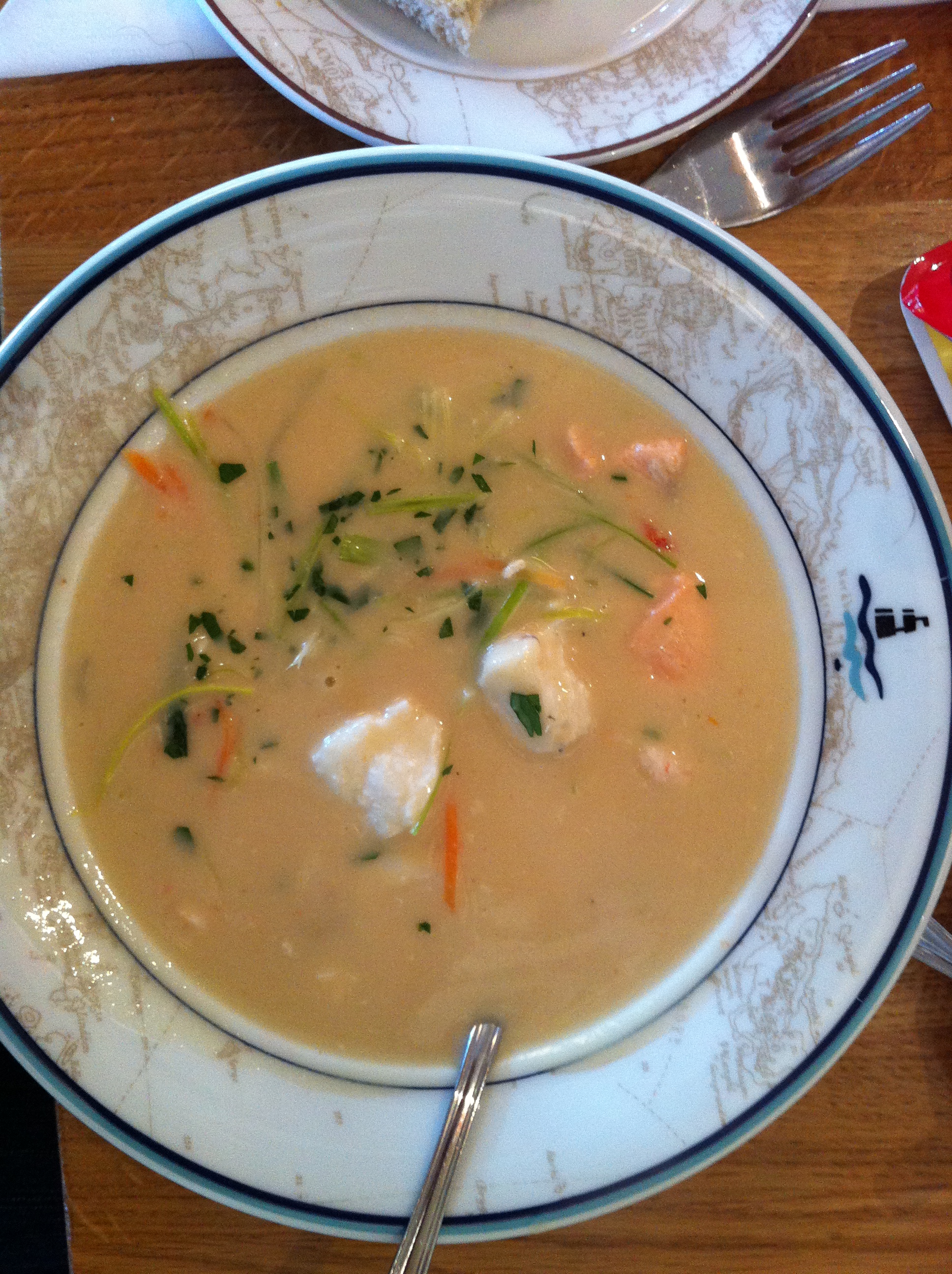Back to the highway, through another tunnel 4 km long to Rennesøy island. We stopped at an old church – look at the monument in the cemetery.                                                         There was a hotel where we stopped to eat – good solid fare – we had the fish soup, which was delicious.