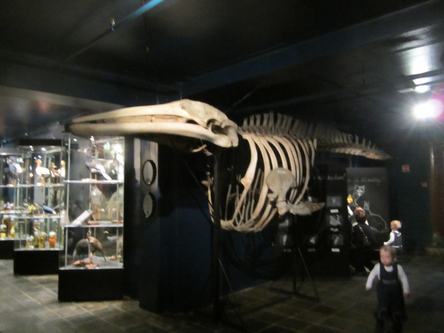 The museum building is old – the first part of it was built in the 1800’s. The exhibit in the basement – Grinning Skeletons – is made up of stuffed animals dating back to the very first exhibits. David had commented on the poor taxidermy job – I guess that’s why it wasn’t up to modern standards. right at the bottom of the stairs, guarding the exhibit, was a human skeleton standing inside the jaw bone of a sperm whale….. I didn’t get a photo because there were always so many people standing by it, but it was impressive. This is one of the whale skeletons.