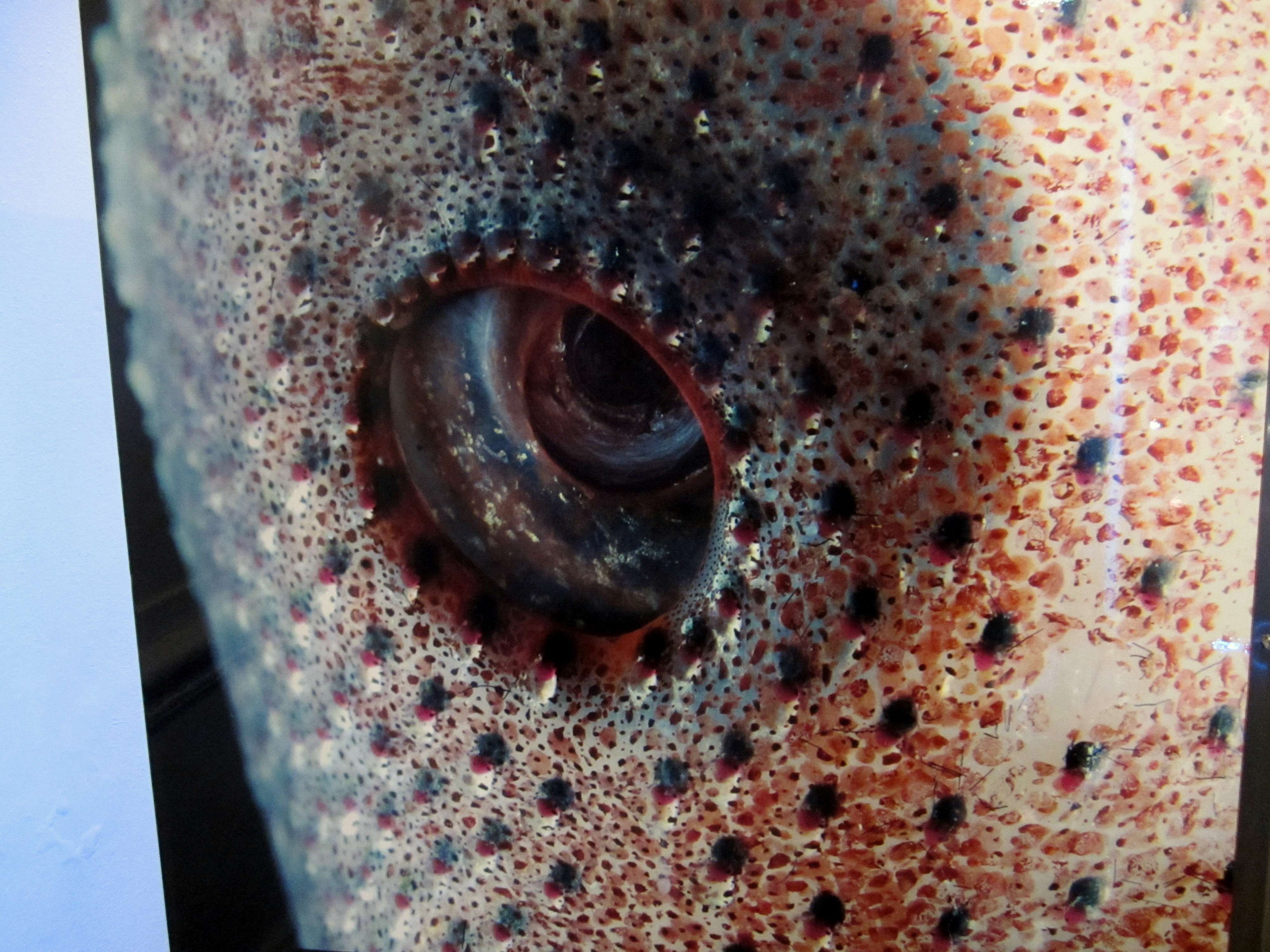 Along with these, there were many examples of art, both photographs and drawings, ancient and modern, of sea life. This photo of a jewel squid by David Shale really caught my eye. The colours, teal and burgundy and gold, had my quilting brain working instantly. This squid was found 500 meters below sea level, and is also called the cock-eyes squid, as it has one large eye which it keeps pointed up toward the sun, and a small one with which it looks down into the depths for prey.