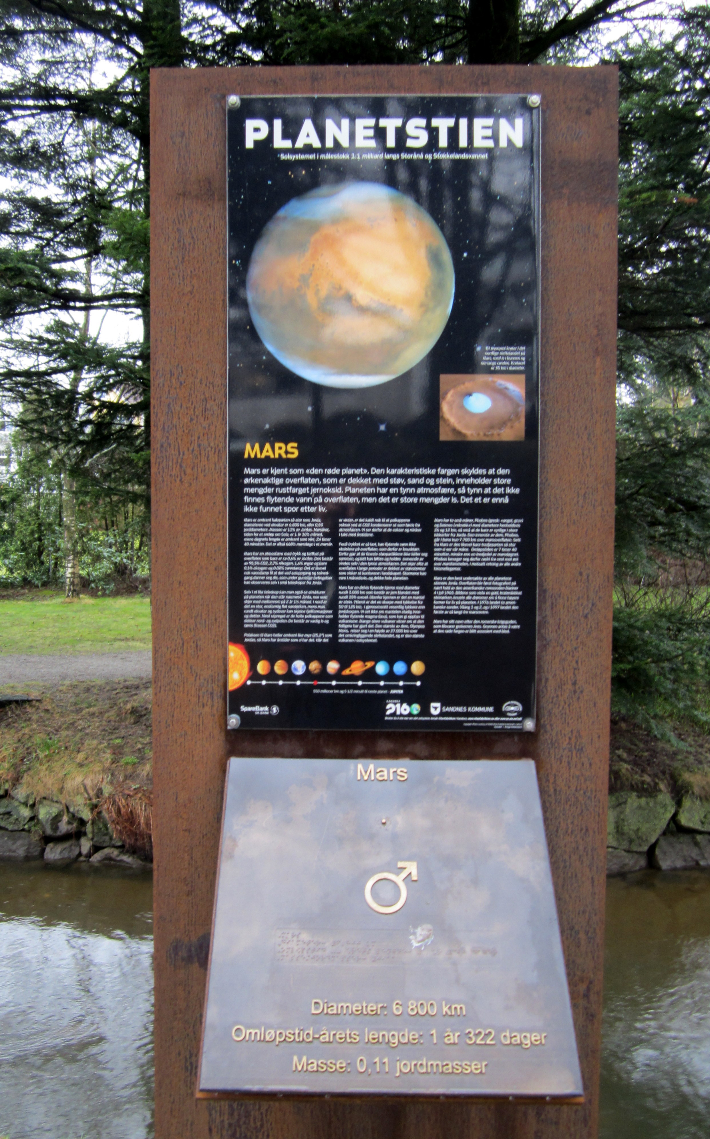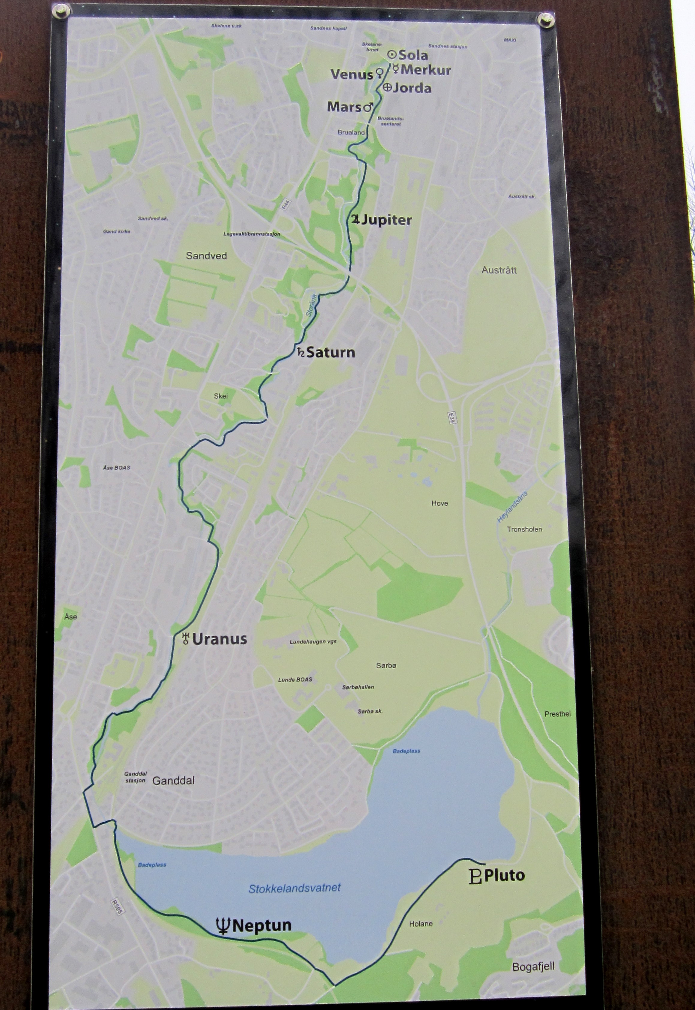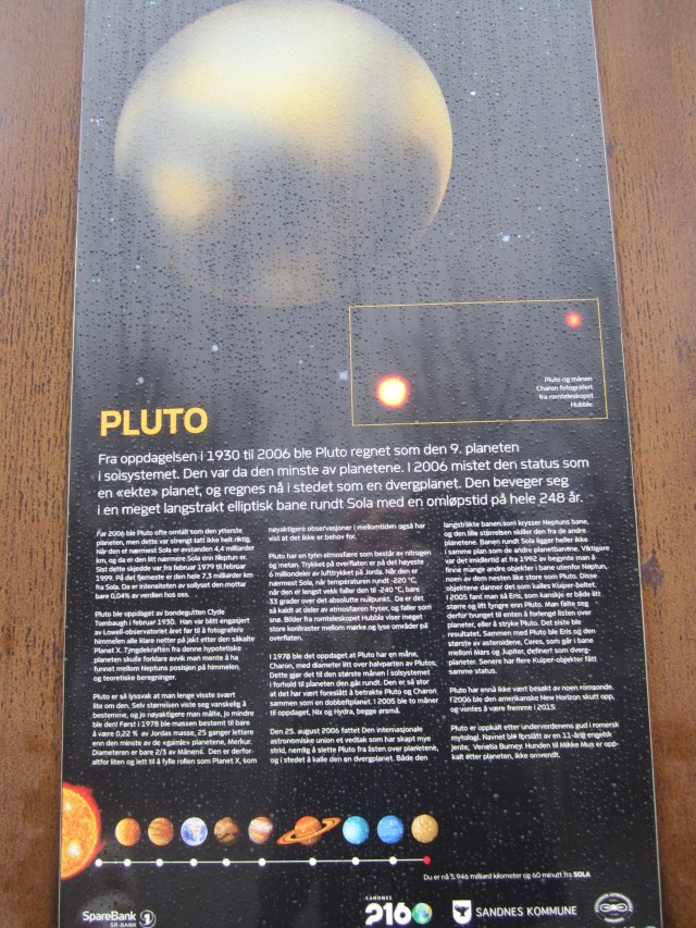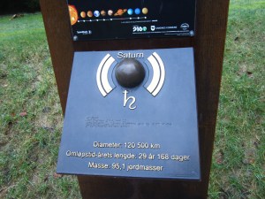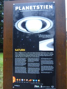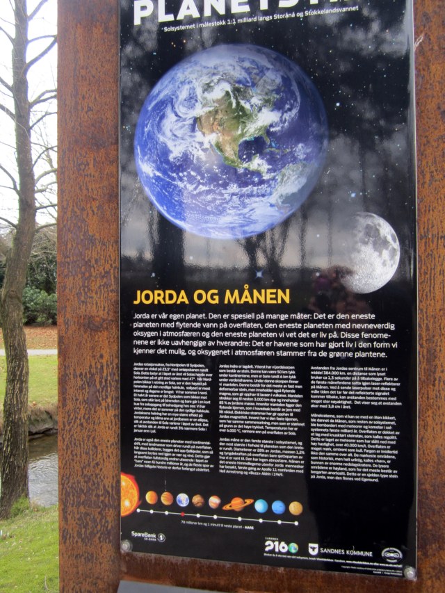 The 9 planets (yes, they have Pluto included, but do say that it is no longer considered a planet) are distributed along the walkway to and partway around the lake, Stokkelandsvanet – and the distance between the stations is proportional to the actual distance between the orbits.