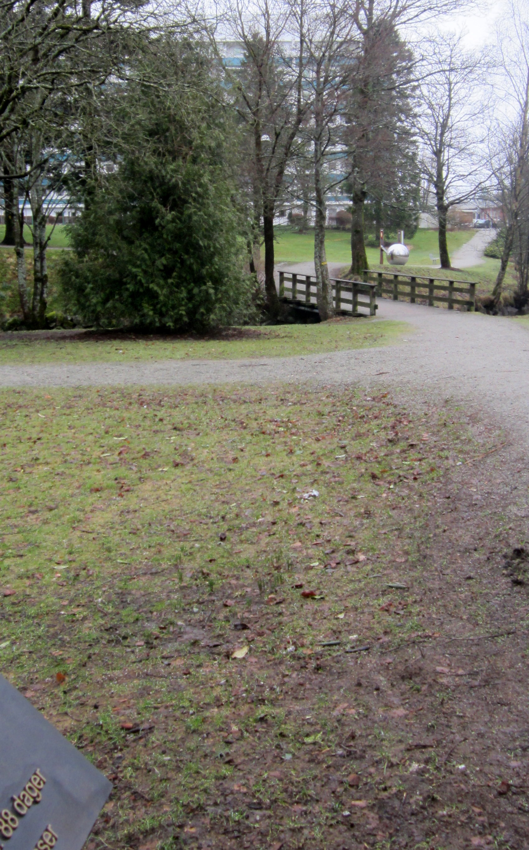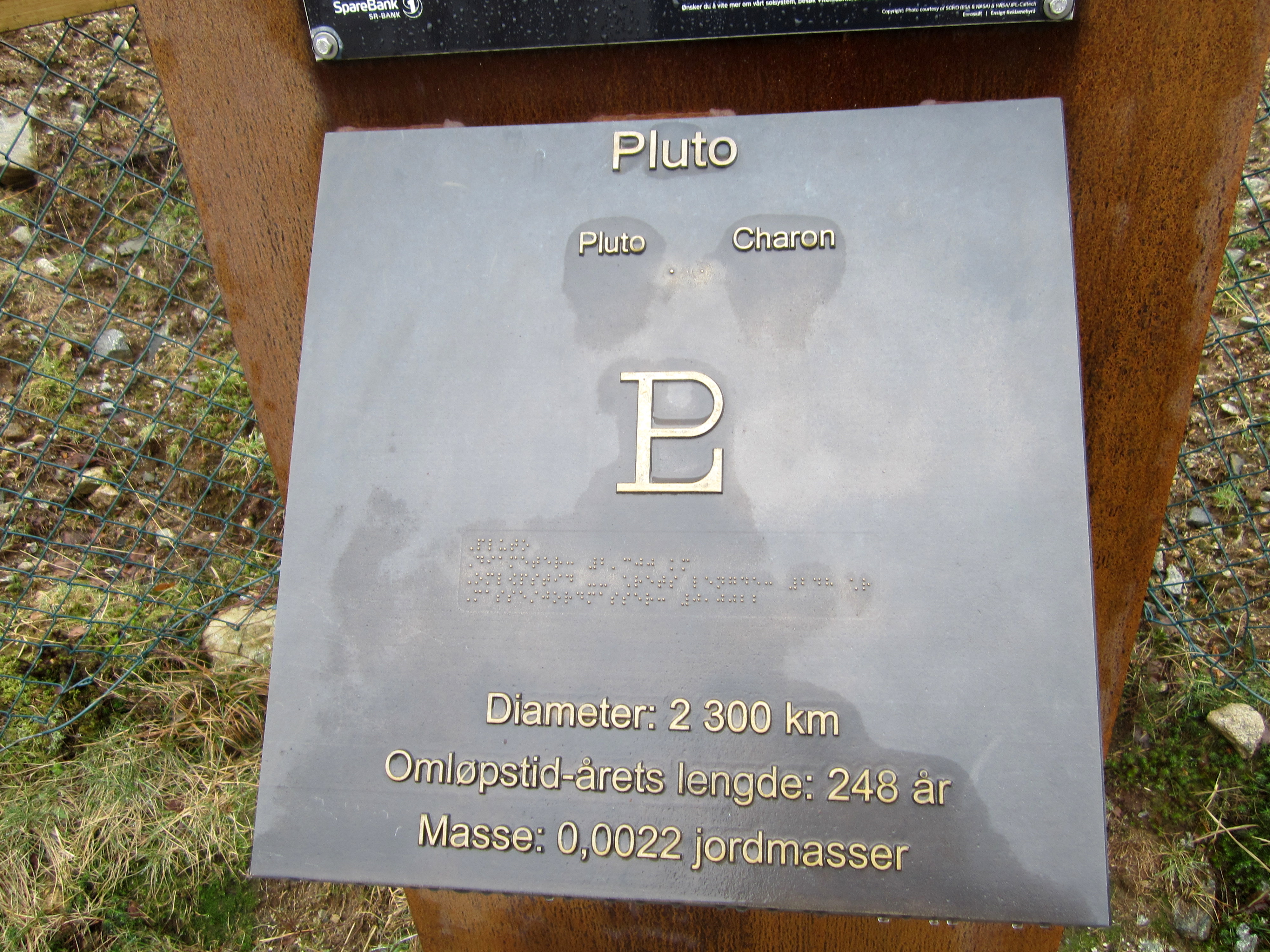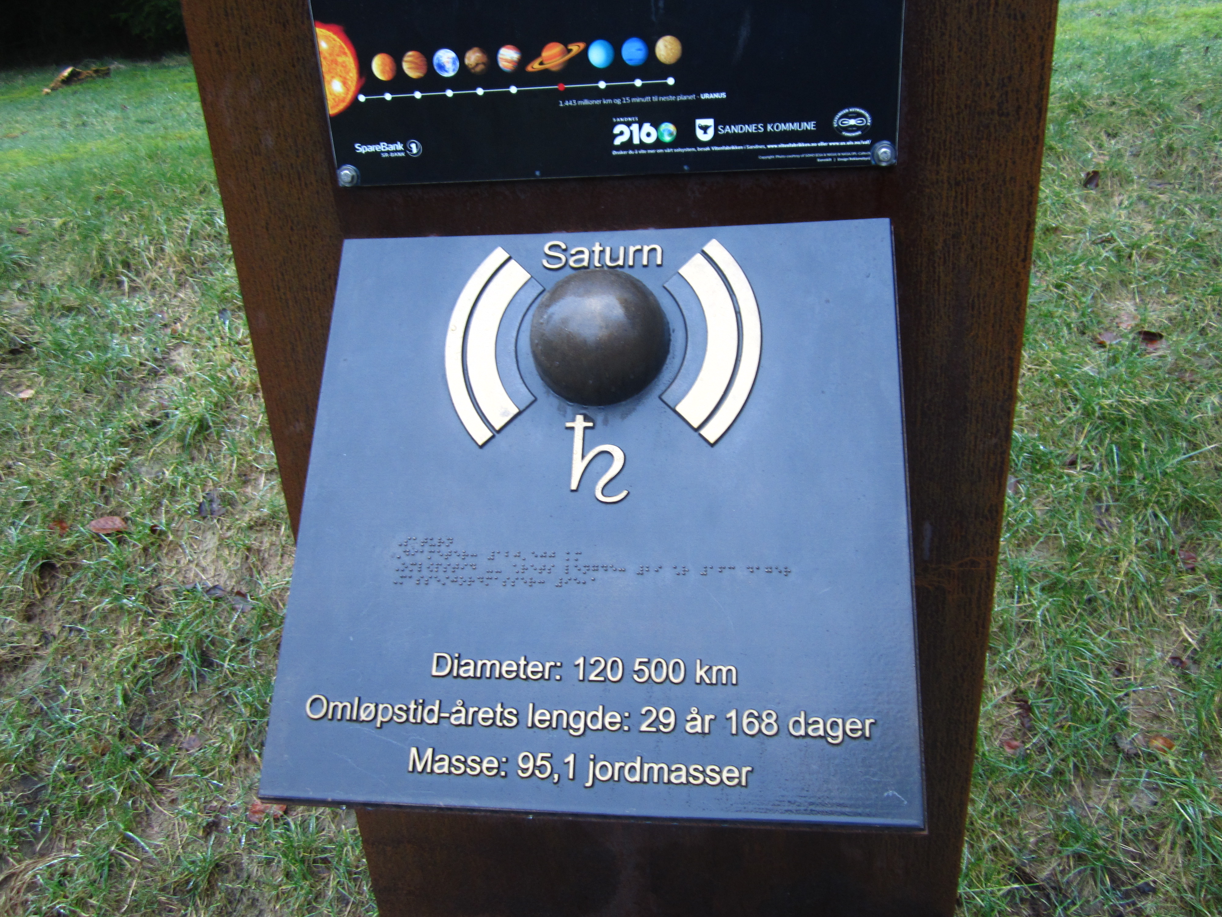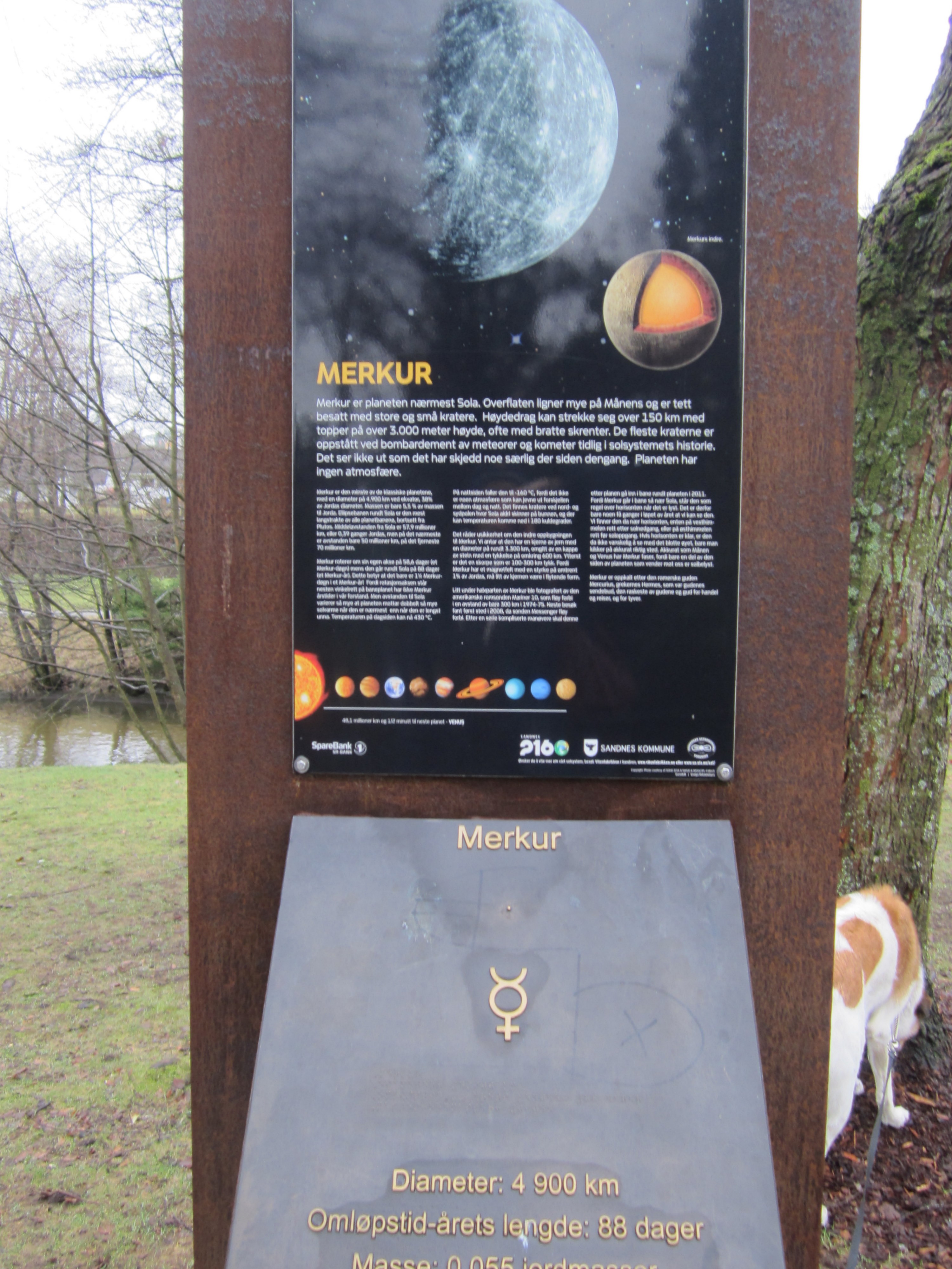 The 9 planets (yes, they have Pluto included, but do say that it is no longer considered a planet) are distributed along the walkway to and partway around the lake, Stokkelandsvanet – and the distance between the stations is proportional to the actual distance between the orbits.