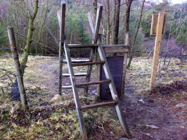 Almost at the top, a style over the fence for the humans, and a pet door for the dogs.