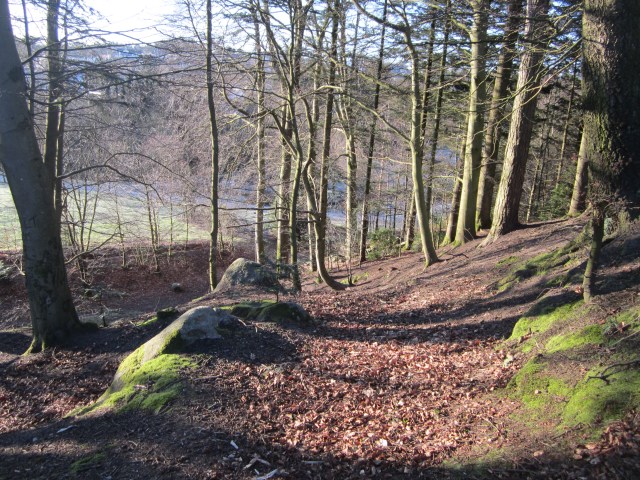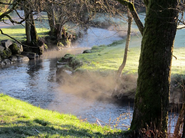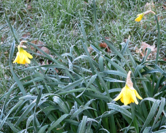 It was pretty crispy when Snoopy and I set out for our morning walk.  We walked along the stream, and the steam was rising into the air.The daffodils were not very happy.  but I had my warm scarf and hat, so I was just fine….. rosy cheeks never hurt anyone, right?We took a different path today – up behind some houses, and then back down into the stream valley.