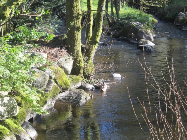 There is a mother duck and babies here in the stream.