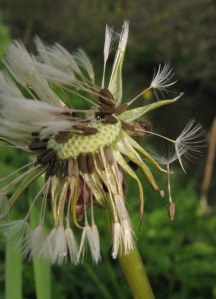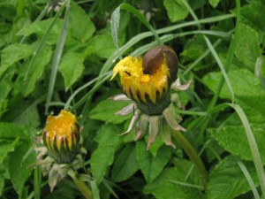 And here is a relative (of the snail, that is) on a dandelion.  The slugs here are not huge, and are all brown, unlike the striking colours they display in BC.