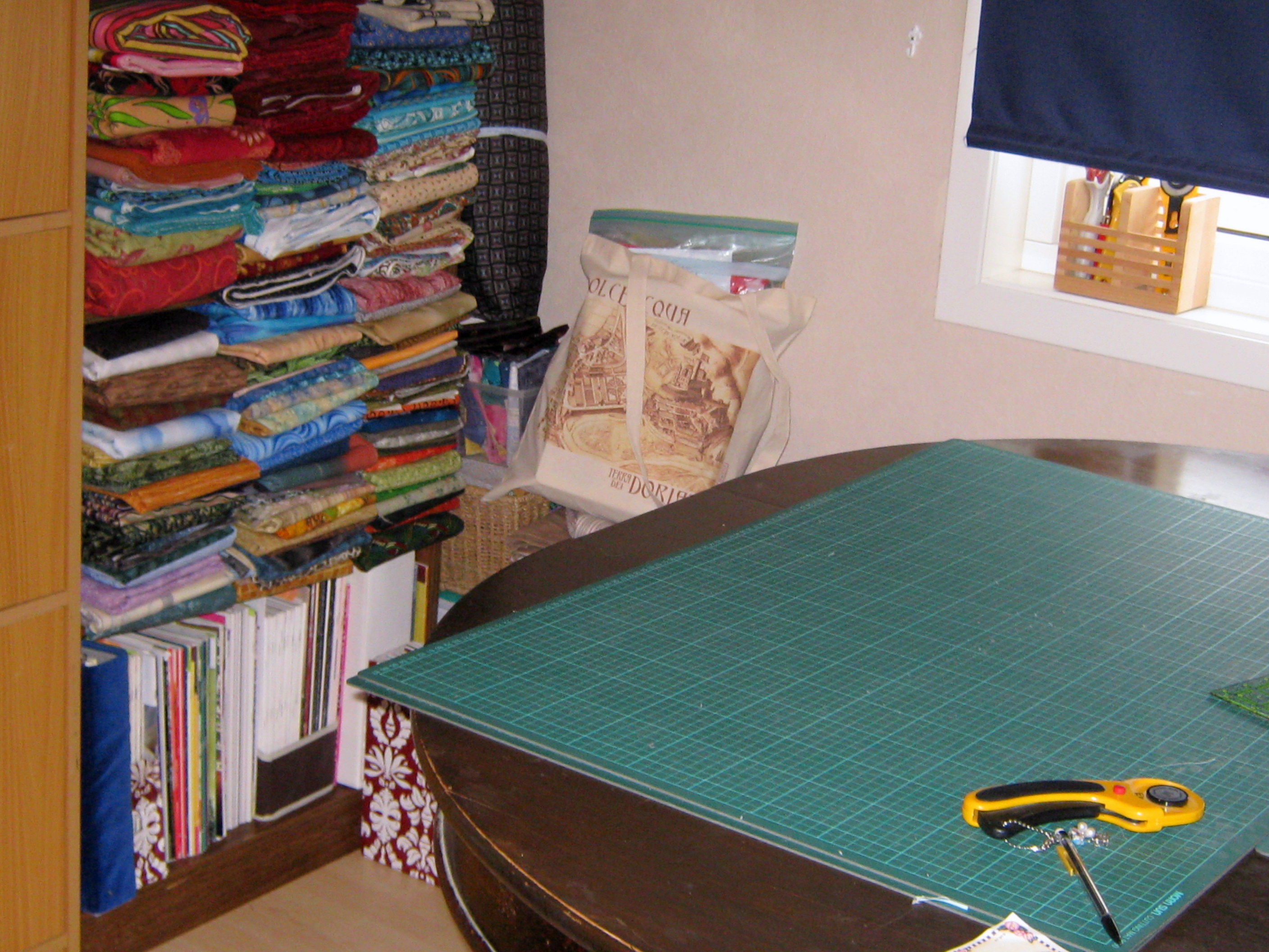I need to do a bit of rearranging in the sewing room –actually, it’s two small rooms, joined together.  Here’s the fabric and cutting area.Ihave lovely big windows to let in the natural light – and right now, it doesn’t get dark until really late. It is a far cry from the space I had in Kuwait and Muscat, but if the muse is back, then I can make it work.