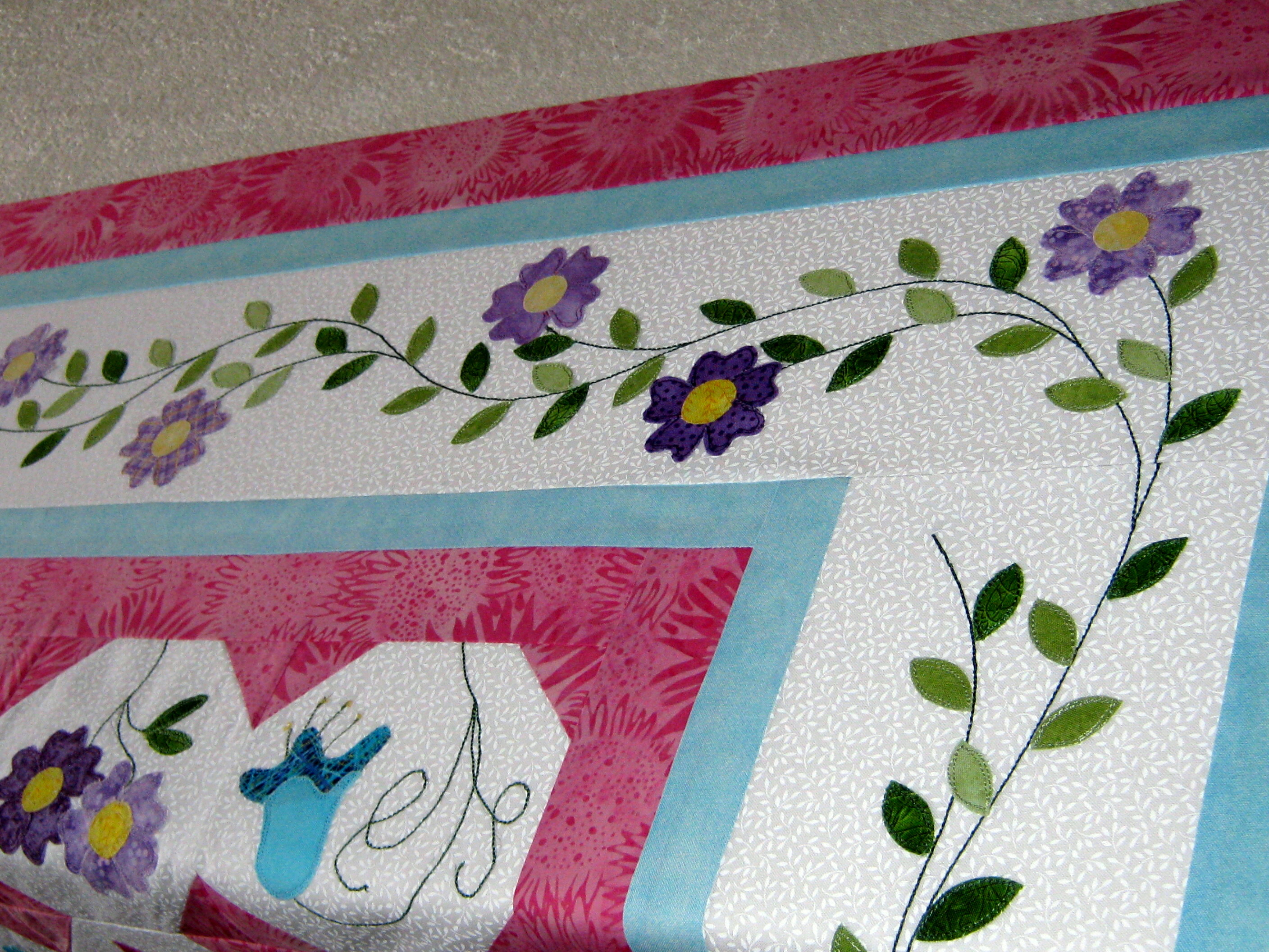Ever since we moved into the house the beginning of March, it’s been as if there was a force field across the sewing room door that I couldn’t break through. Once I had my fabric and other things unpacked, I rarely went in – always something else to be done, especially in the mornings. By the time I was free, I just felt too drained to concentrate.  When I did risk looking at the borders on Aaryana’s quilt, I discovered that I’d done one section wrong, and, aside from unpicking the stitches and redoing the 2″ bit, nothing.