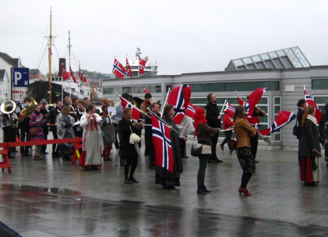 The streets were lined all along the route, in spite of the weather..with young and old alike.There are also concerts in various locations throughout the day.  There was one at the Domkirke – the old cathedral – that I would have loved to attend, but by the time we had stood in the rain for over an hour watching the parade, I’m afraid that my whole mind was on getting home and curling up in a blanket.  This being Norwegian takes stamina.