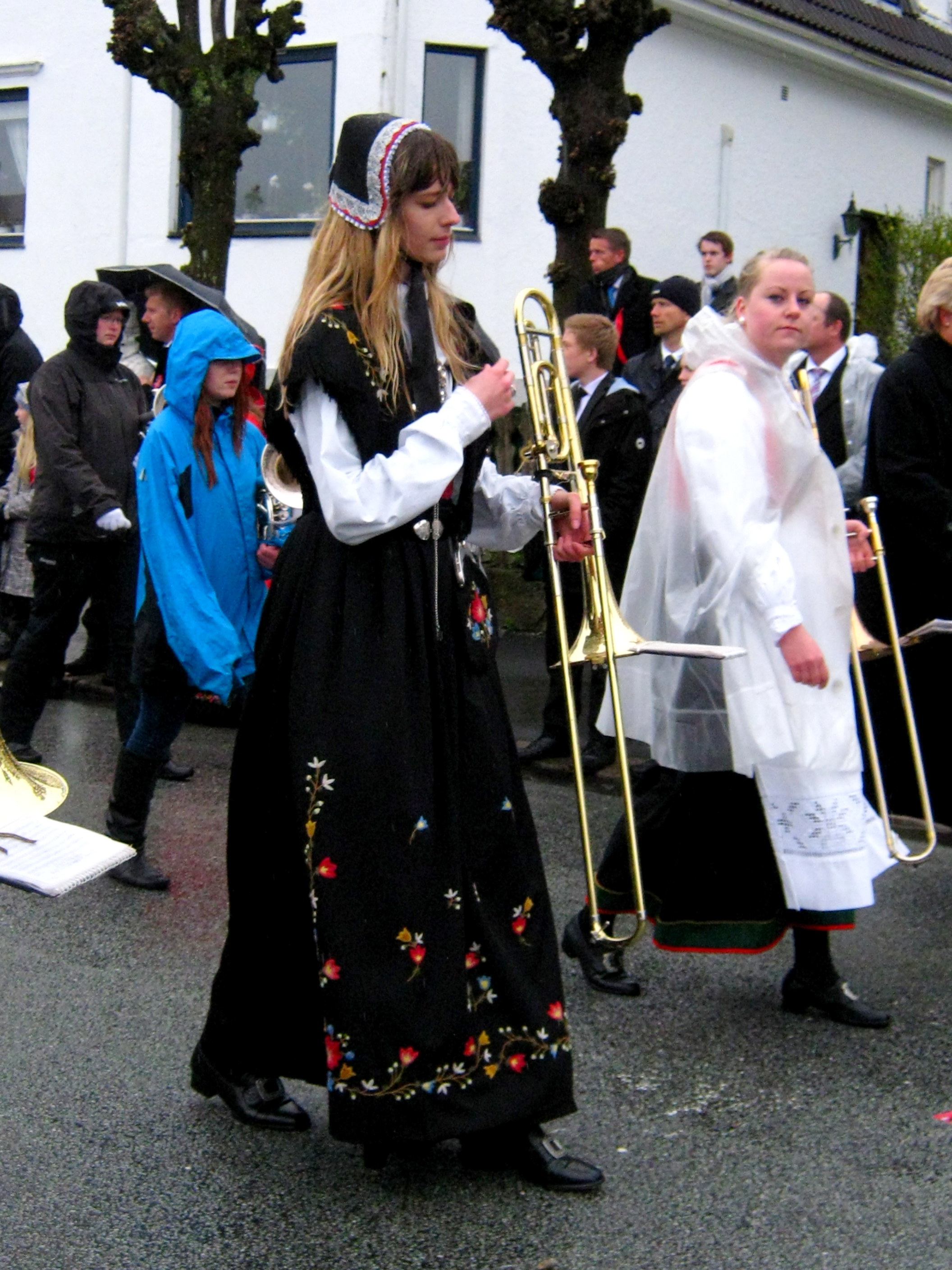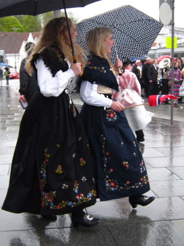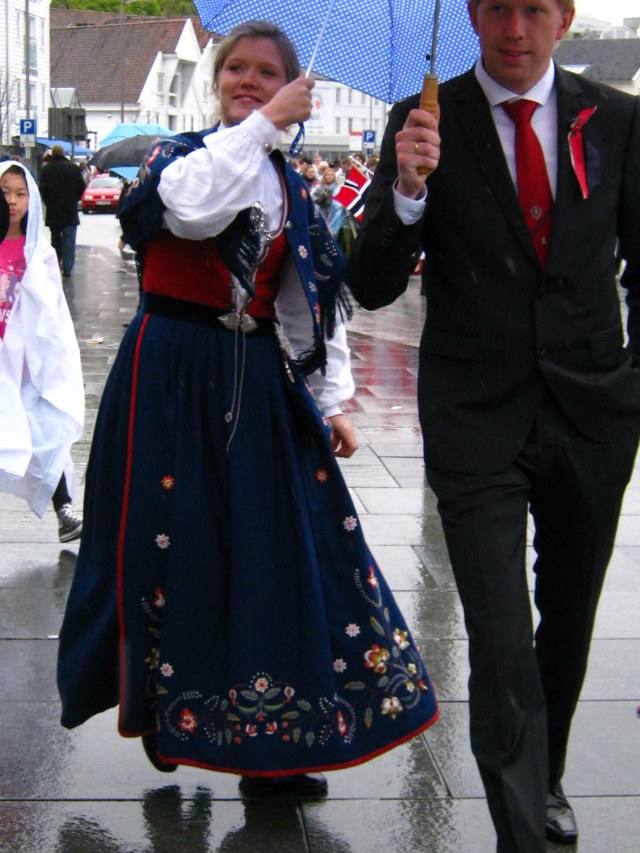In true Norwegian style, Thursday was rainy – to be exact, the second straight day of rain.  And, as you will see, there they were, in their stunning traditional costumes, celebrating as if it was the nicest day of the year (it was, almost  LOL).  You have to hand it to them – these Norwegians are tough.  You don’t live in a land of ice and snow and rock and cloud without being able to handle whatever Mother Nature throws at you – with a smile, no less.