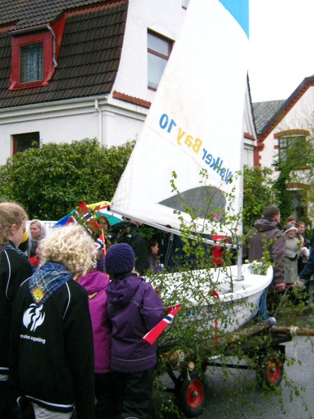 The day is celebrated throughout the land with parades……… lots of parades.  After the ceremonies at the cemeteries in the morning, and the flag raising, there is a children’s parade. The children from all the various school walk, dressed in their very best, waving Norwegian flags.  The school bands play.  In the afternoon, there is another parade – sports teams and dance clubs, choirs singing as they marched along, and, of course, more bands.  They love their bands here – and they are good.  And no floats like we fill our North American parades with – well a couple – here is one-but no one is riding on it!