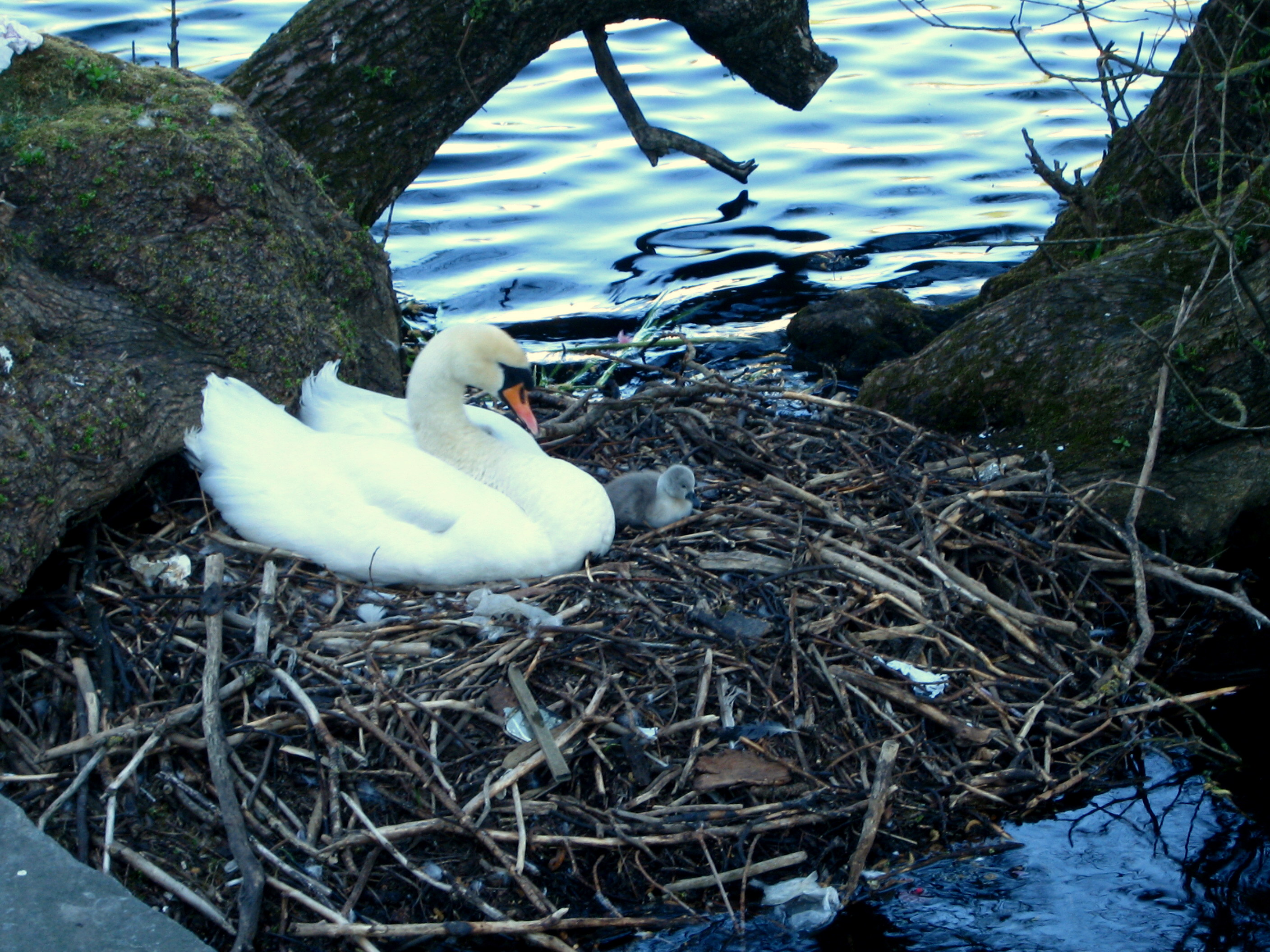 When we approached Stavanger Sentrum, we rode around Breiavatnet – a little lake near the harbour that was said to have been caused by a troll throwing a boulder to stop the noise of the cathedral being built in the 1100’s.  There has been a swan sitting on eggs right along the edge by the bus stops – and her cygnets have hatched.