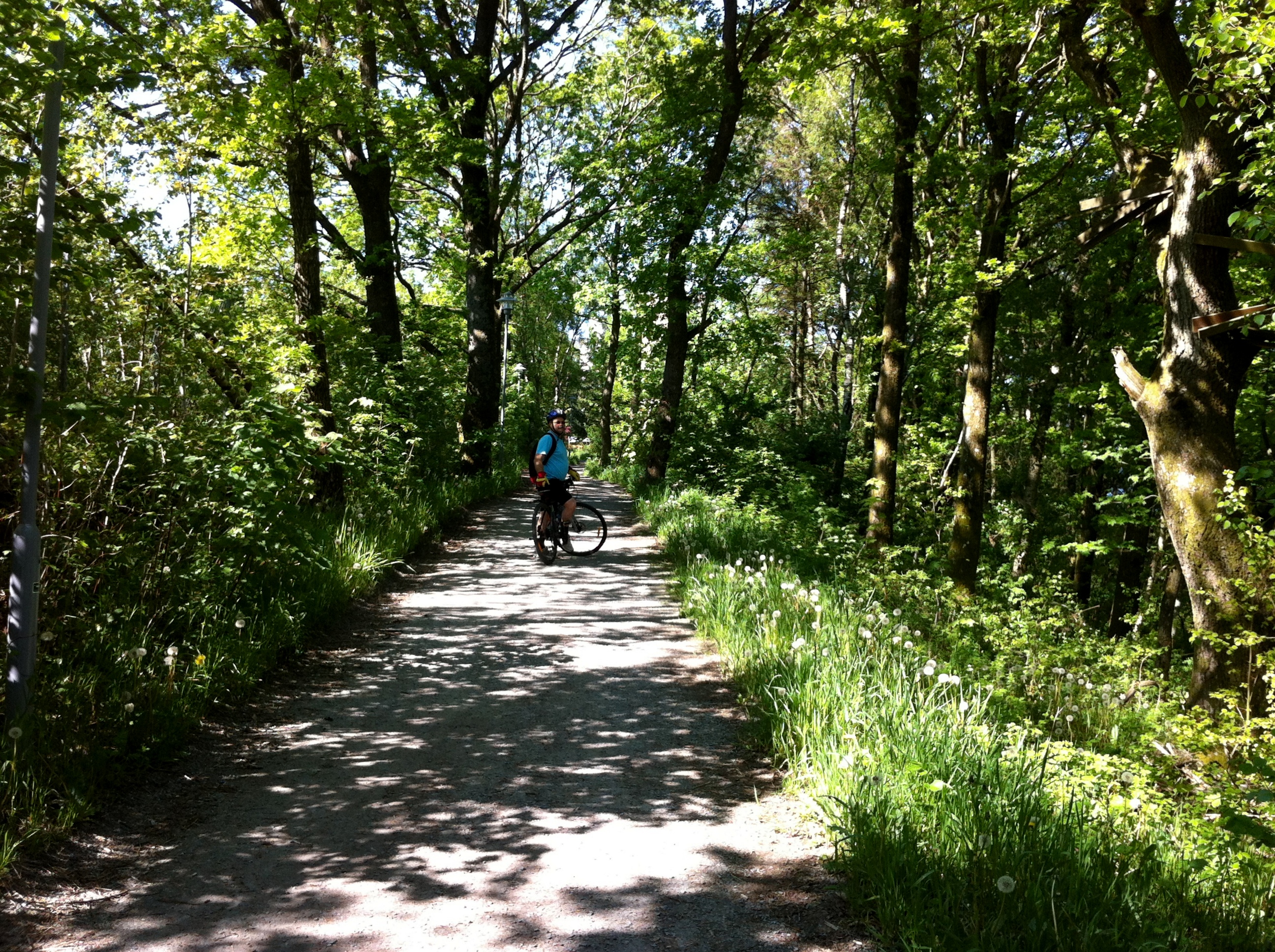 When we got to the north end of Sandnes, we saw a path right along the fjord, but didn’t see how to get over or under the railway track to it.  Maybe back at the marina….. off we went, only to discover that was NOT the right way.  Back we went – glad that no one was sitting on their front step right there, wondering where on earth we were going.