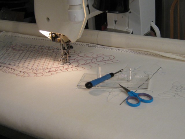 Today, I set up the machine and put on an old practice piece I’ve used earlier. It’s not great material, but works for practice. It has its own leaders on it so I can just stick it on whenever I want to try something out.  Over 8 months……will I remember anything at all?  I have green thread already in the bobbin, so the pink I’ll use on the baby quilt will contrast and show if I have the tension balanced or not.  I have a problem with stops and direction changes creating knots of bottom thread on the top of the quilt – so when I actually do the quilting, I’ll make sure top and bottom threads match to minimize the problem.  I’d really like to have a better solution, but I think that the Bailey is just a bit slow in responding to changes – or may be I need to move even slower than I do, although I’m no speed demon. Needle threaded – bobbin thread up – ready, go!  Swirls first, and then meandering feathers.  A bit jerky, but pretty soon I’m beginning to retrace lines with a modicum of accuracy.  I installed the ruler foot and got out my little 6 inch quilting ruler, and tried some straight line….. it’s difficult to remember NOT to press hard on the ruler, or you just keep the machine from moving freely.  I need to practice this a lot, but I think I’ll remember. I’ll be stitching-in-the-ditch to make sure the quilt is straight (keep straight lines straight, Marline Turner emphasized).