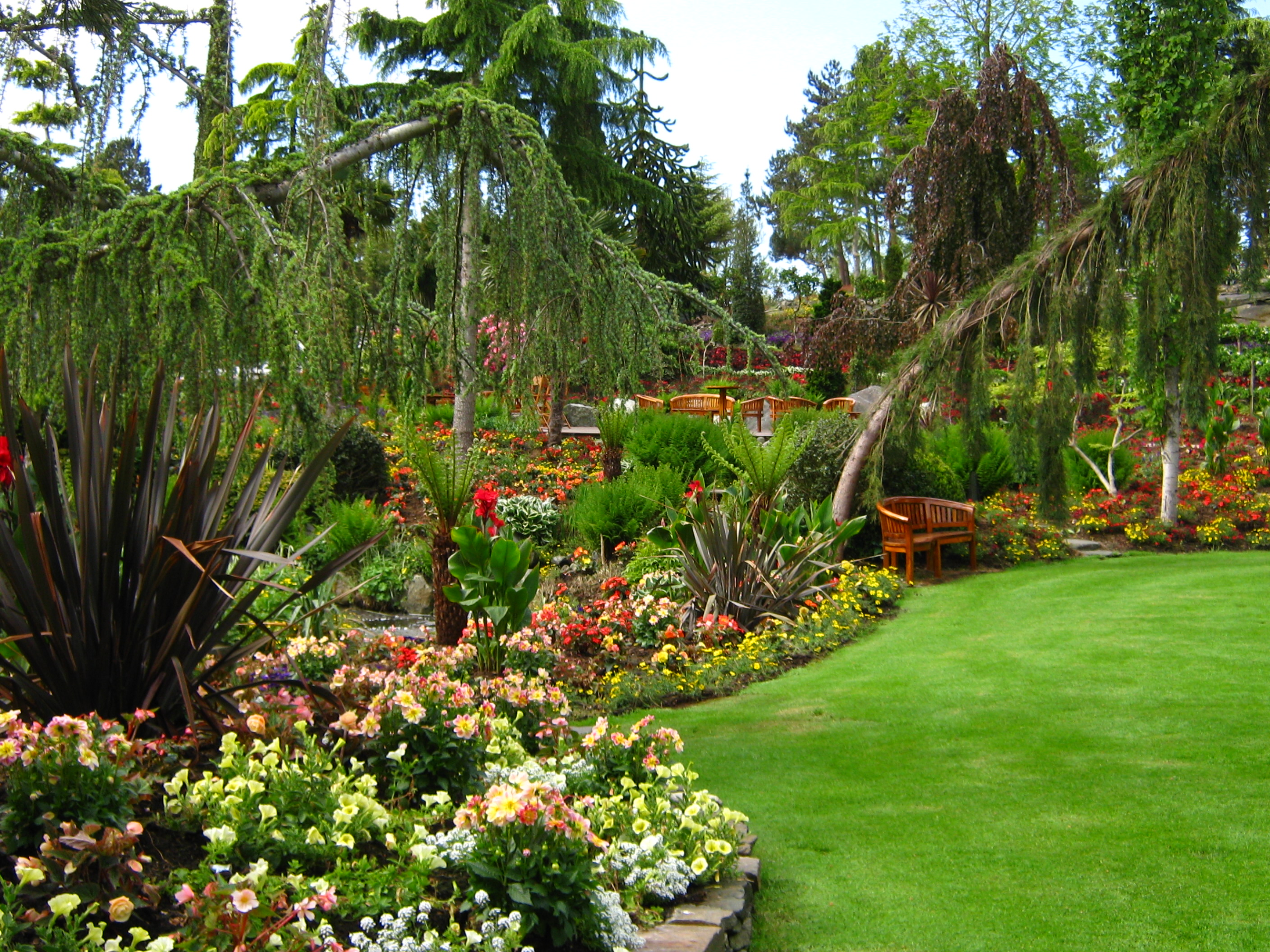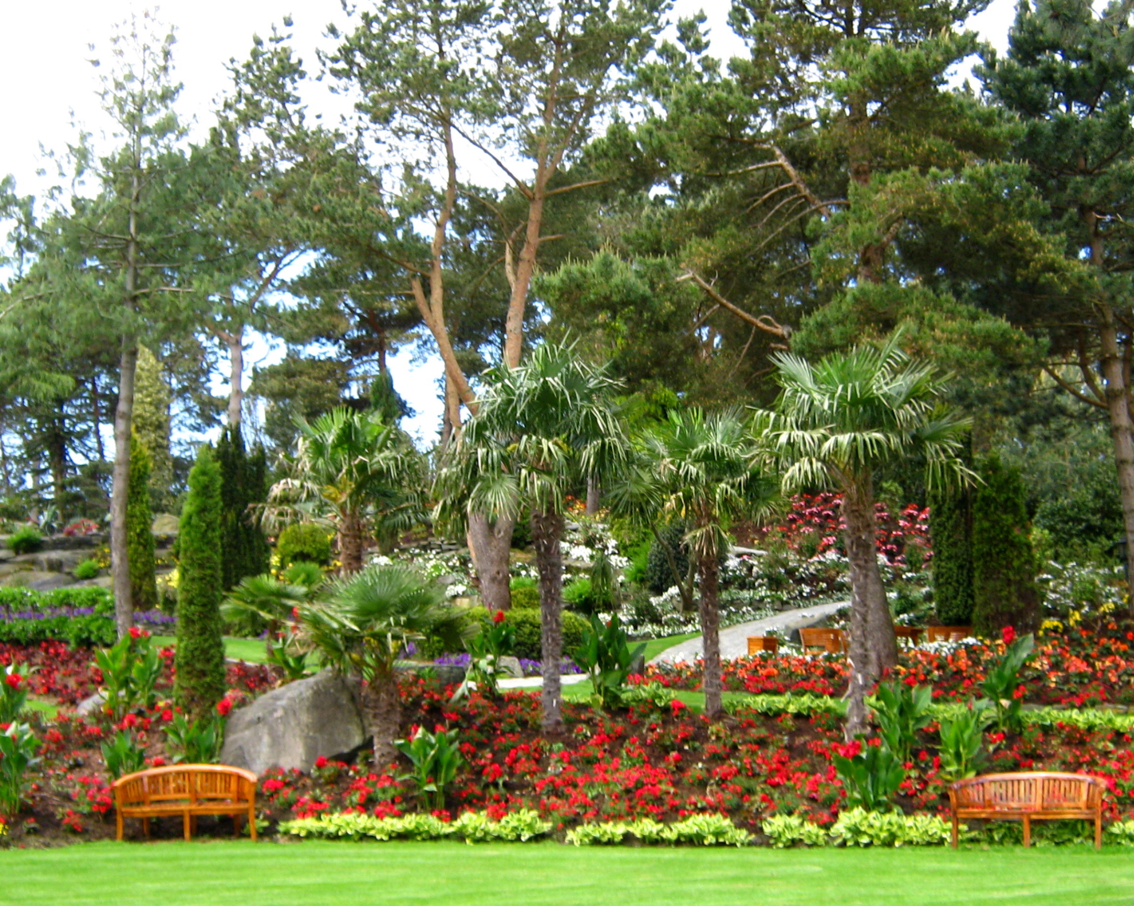 Off the boat and welcomed by the chef, we proceeded around the corner – and we were in wonderland. Tall trees, hills, ponds, streams…… and a riot of colour.  And yes – there were palm trees.