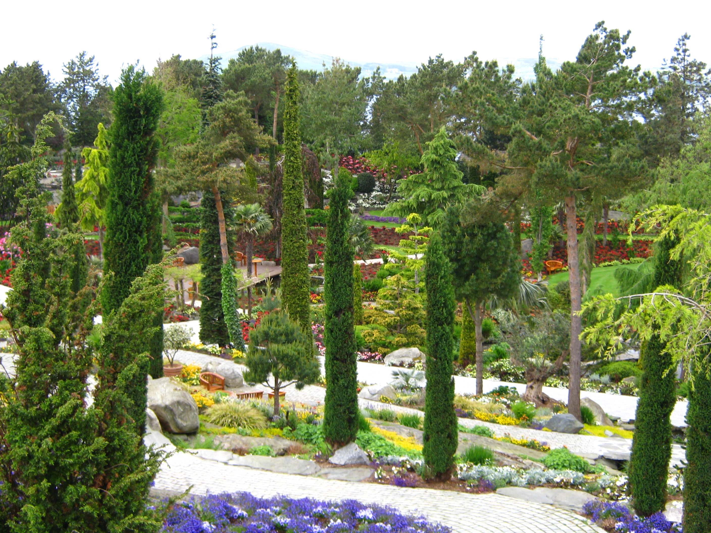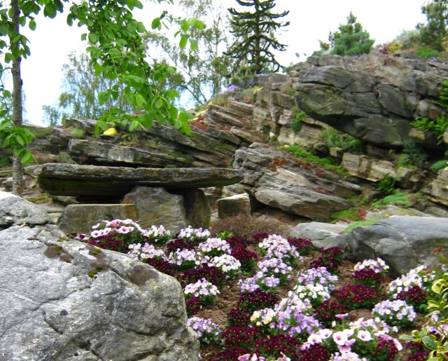 We were treated to a tour of the estate, now grown from the original 4 acres to 20, and encompassing several ponds and falls, and many different garden areas, each with its own theme and colour scheme.  We went down a hill toward the sea past a natural stand of birches and towards the cloister garden where the herbs used in the restaurant are grown. The top of the table there is what is left of the roof stone for the cave the original owner used as cold storage.  It was much larger – but the story is that sailors would shelter in the cave when seas got too rough, and the neighbor didn’t like it, so he broke it into pieces.