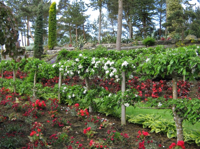 The trees are a major player in making the micro-climate that allows this miracle to flourish.  They use tall, skinny trees, or prune lower branches so that they maximize the sunshine while providing protection from the winds blowing in off the North Sea.  Some more tender specimen, like the citrus trees, are wintered inside as well.