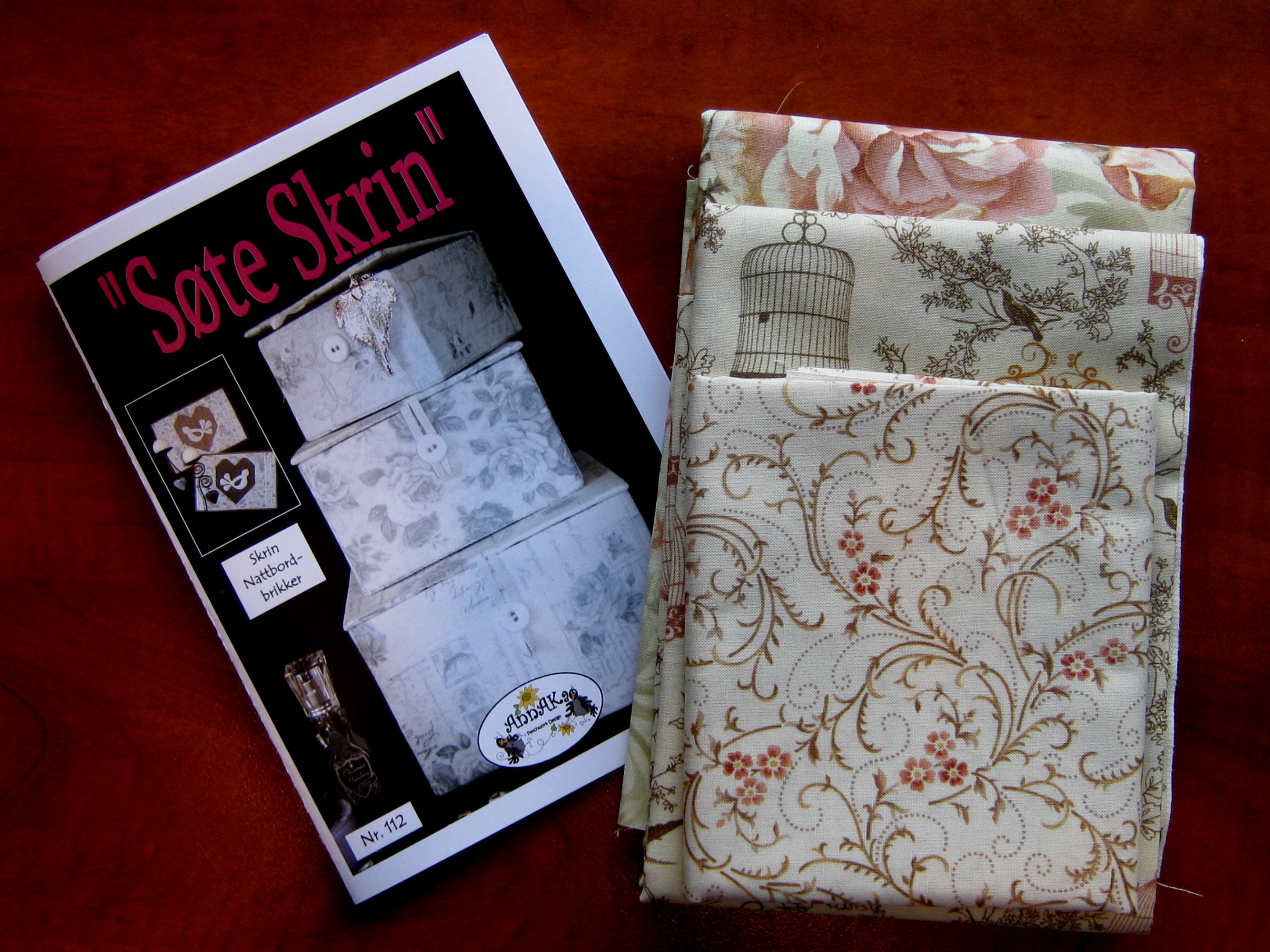 Last but not least was the lotto game – winners of past prizes bring gifts to be drawn for.  I won the last prize – and a pretty good one it was – a pattern and fabric kit for small boxes and two night-stand runners (Sweet Boxes)……….and almost missed it because I always forget the difference between 4 and 5 in Norwegian. The instructions are in Norwegian