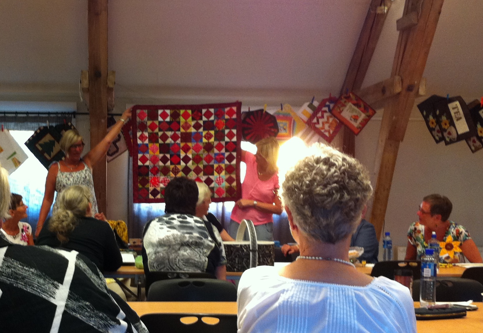 Here are a couple of other shots from show-and-tell…..it was place mat night, so you see some of them strung up behind.