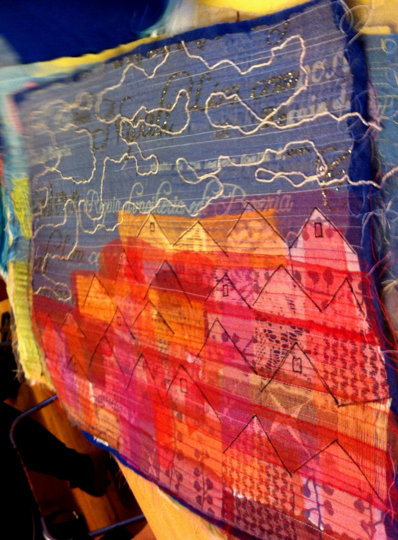 The meeting flowed around me – 30 ladies doing hand work and chatting about their summers. I concentrated on my applique as there is no use even trying to understand when that many people are talking at once.  When the leader of the group spoke, or someone was doing a demonstration, I paid strict attention – catching only a word or two – but that’s OK. I sat beside Nina Moen, the author of the quilt book.  She is a wonderful, dynamic lady.  Here is one of her most recent experiments – she went to the local Salvation Army store for materials. Sorry for the weird angle, but I was sitting right beside.Nina will be teaching a free motion quilting class in September, and I plan to attend.  I can always learn more patterns and ways to think of quilting, whether I am doing it on my Janome or on the Bailey and frame.  It will also give me a chance to listen to Norwegian being spoken in a smaller group – and her English is as good as mine, so I won’t miss anything important.