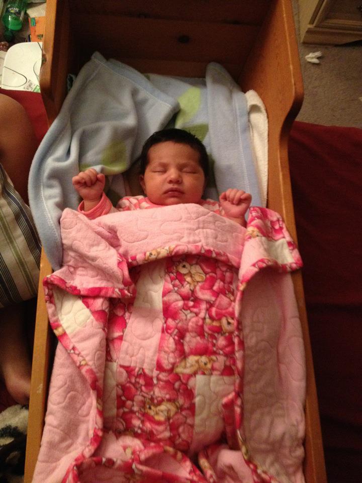 Here she is in her Daddy’s cradle, with the first quilt I gave her. I’d made it long ago, just because I loved the flannel print with the hearts and bears.