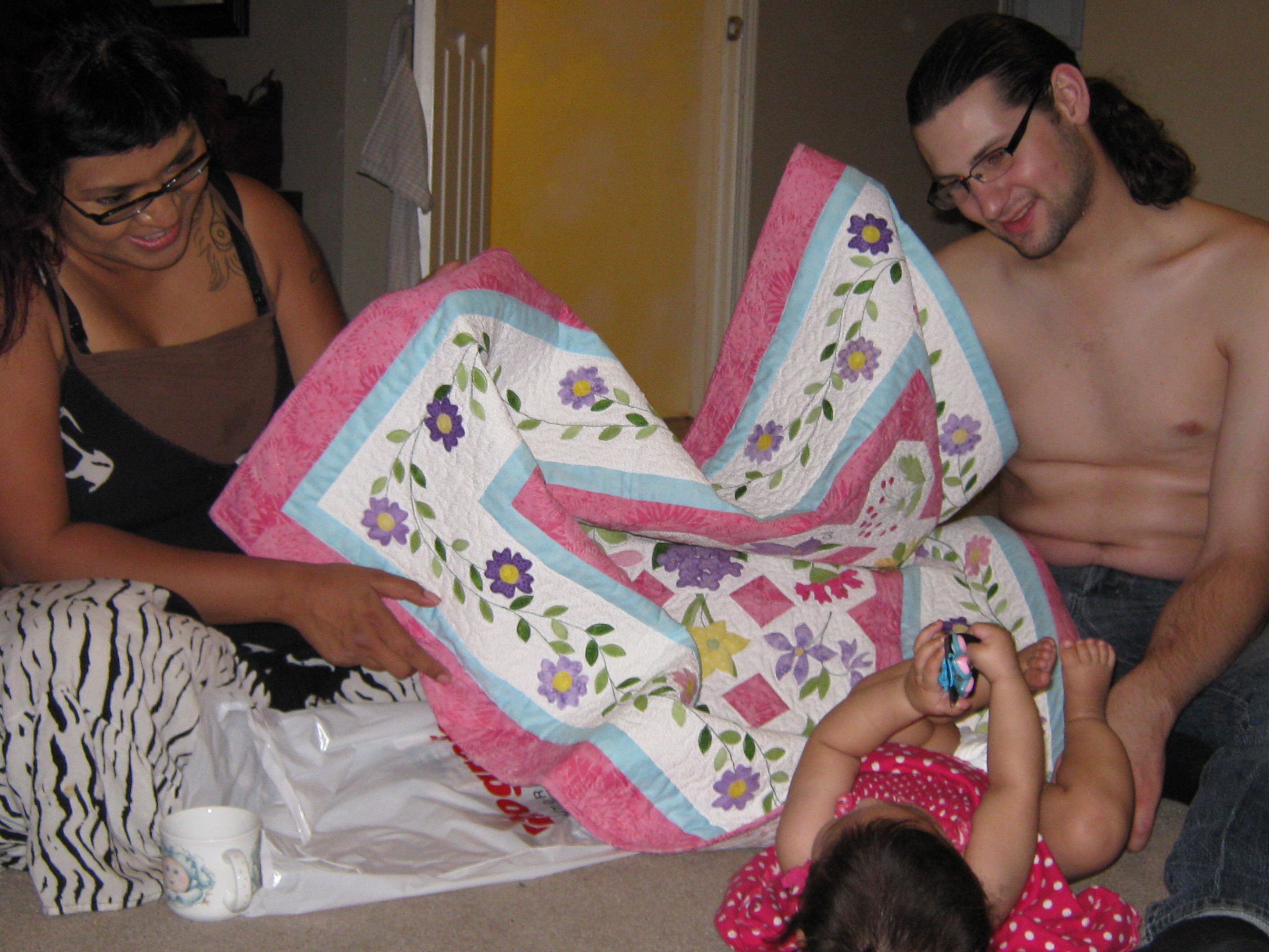 Aaron and Jen (and Aaryana) receiving the quilt – and Aaron quizzing me on just how it was made, especially the binding.