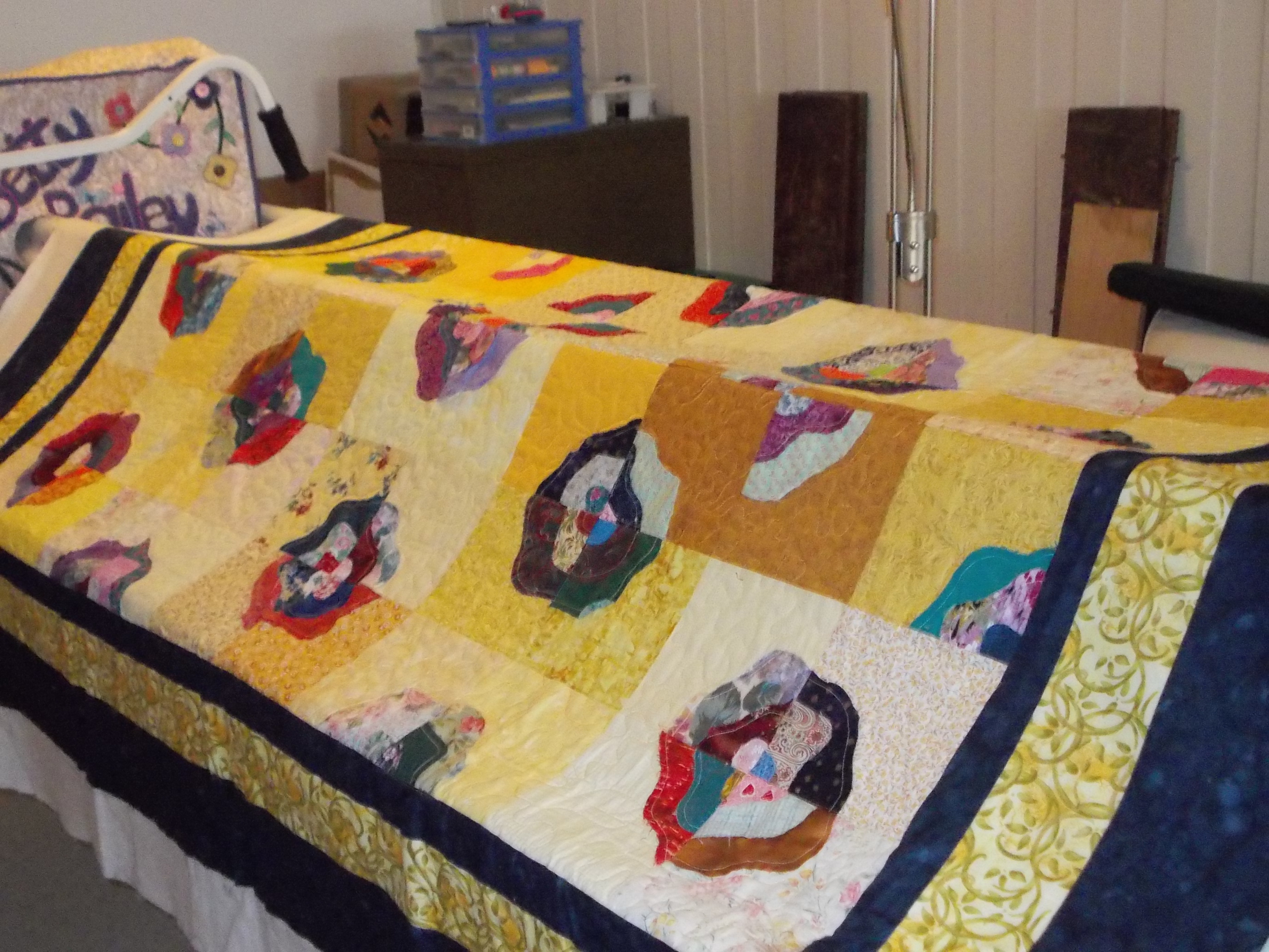 Two small adjoining rooms, Sara – one JUST big enough for my shelves and cutting table – the other a squeeze to get my ironing board, sewing machine and a couple of boxes in. The frame is set up in the basement.