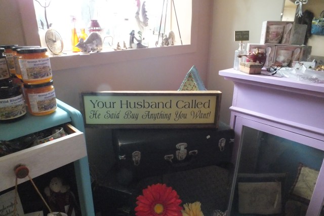 We parked a couple of blocks away, and had to pass by a little antique shop with the darlingest cane-seat rocker outside. I would have loved to buy it, but of course, we don’t have a house in Canada to put it in, and I didn’t think it would fit in my suitcase. They had some neat things inside as well – including this sign… I think every woman should have one.