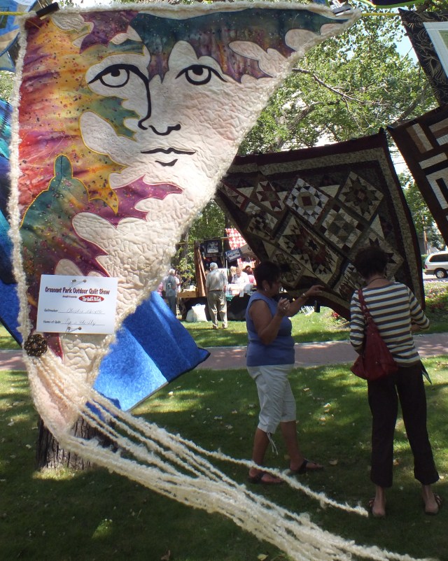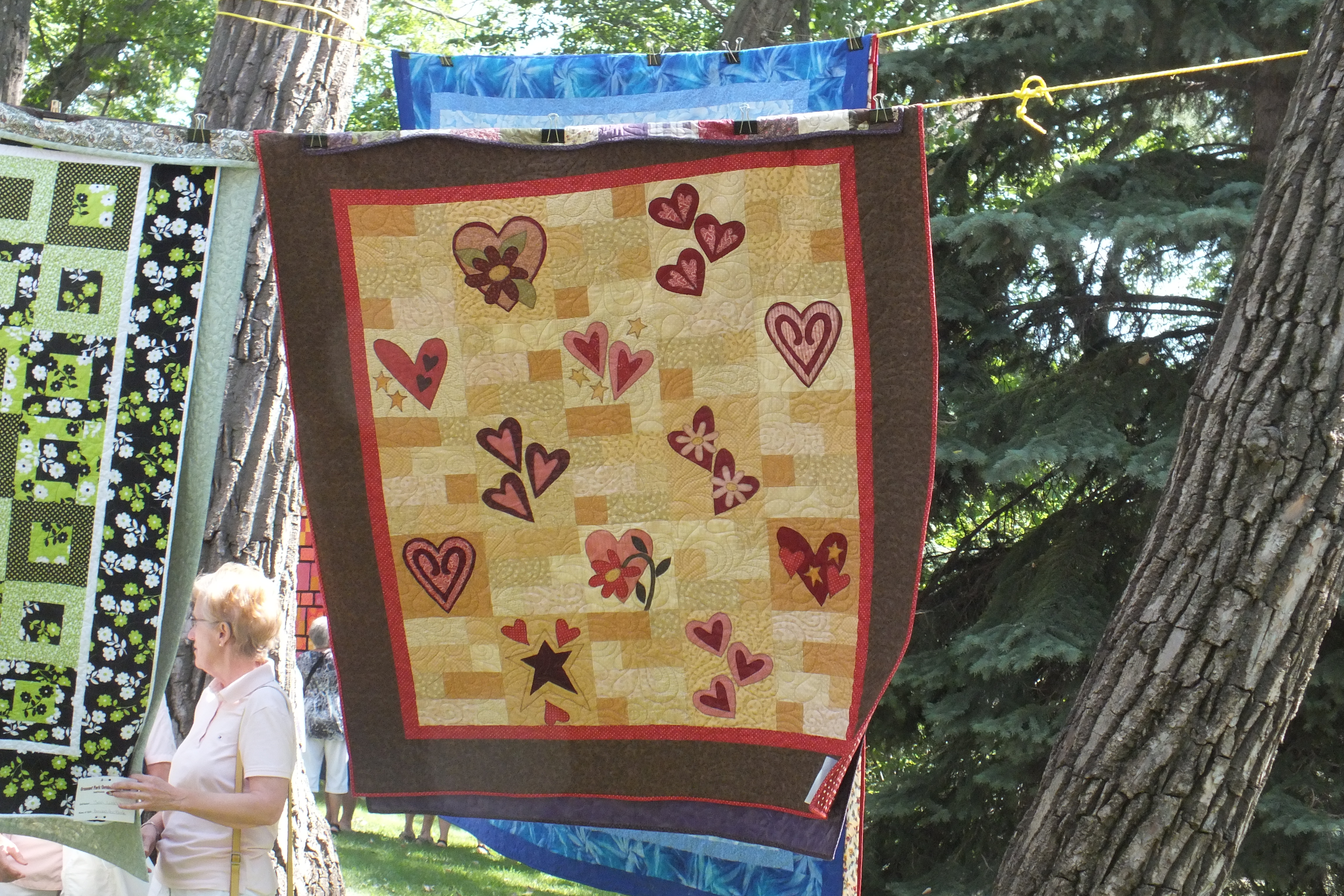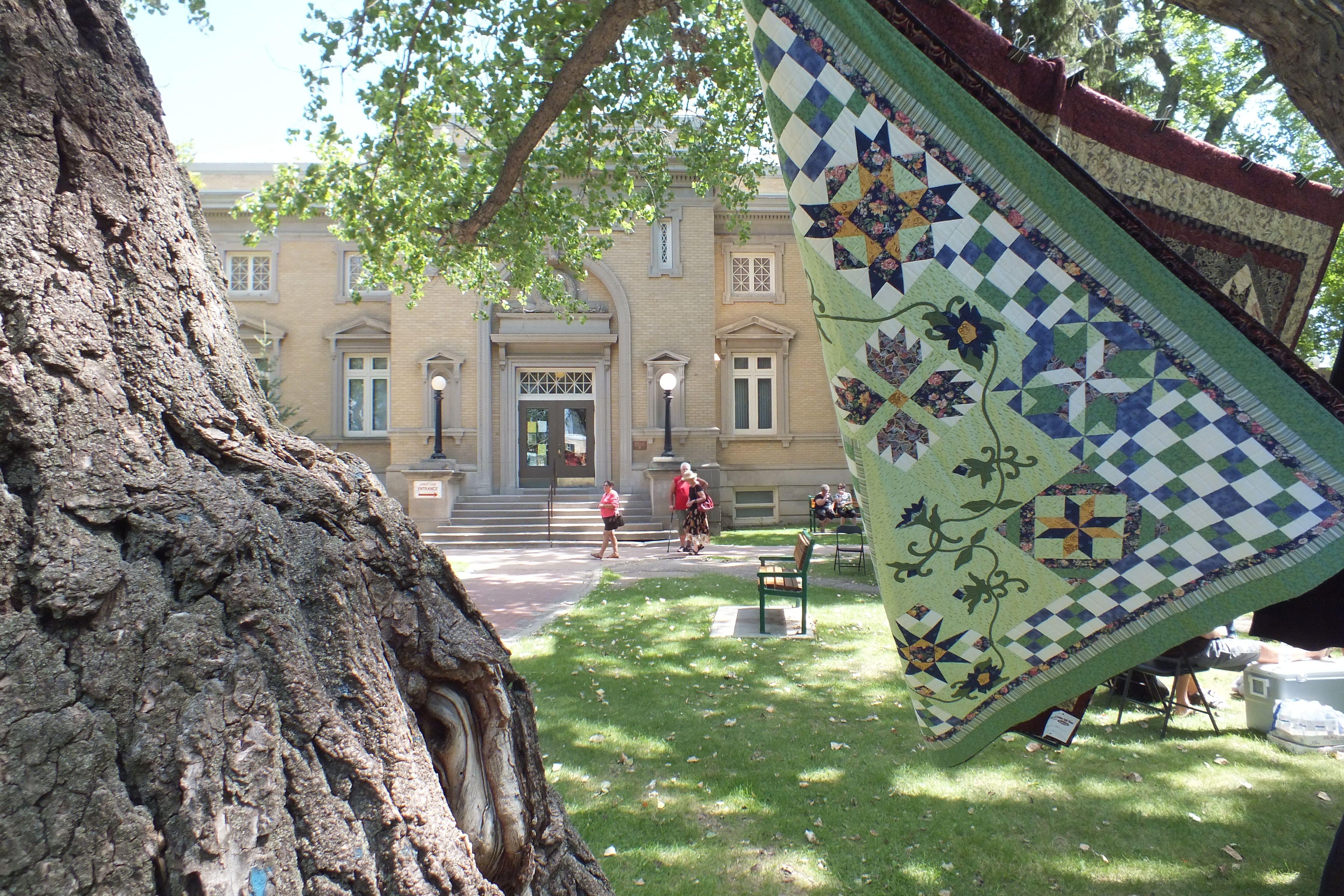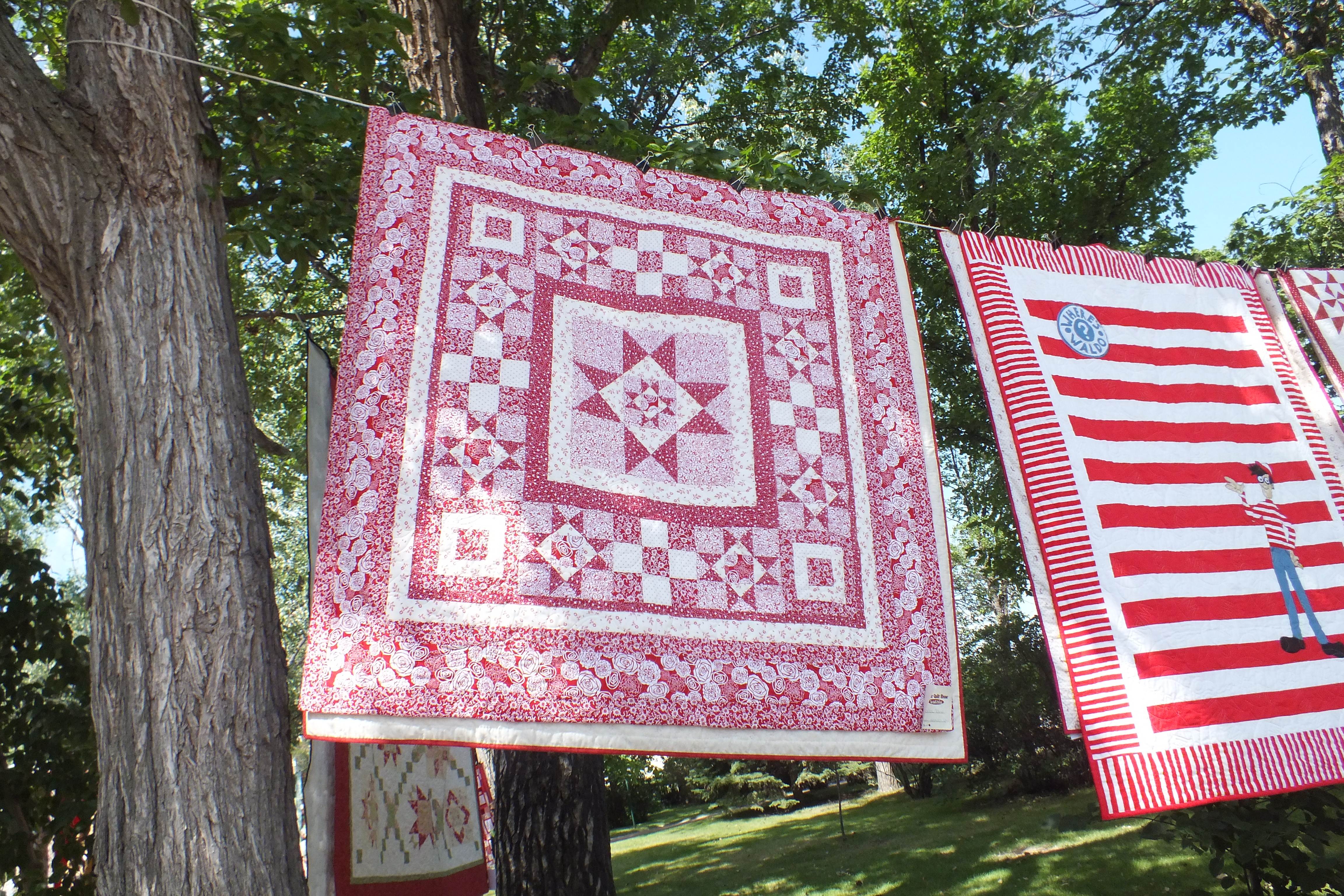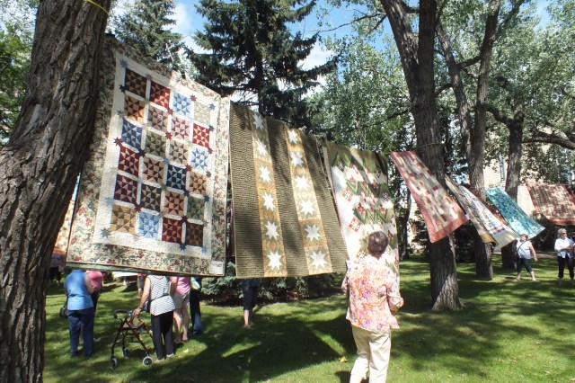 While we were back in Canada in July, I got the chance to attend to a quilt show in Moose Jaw, Saskatchewan with two friends. They have a lovely old park, and beside the library they had hung quilts on lines between the huge old trees.