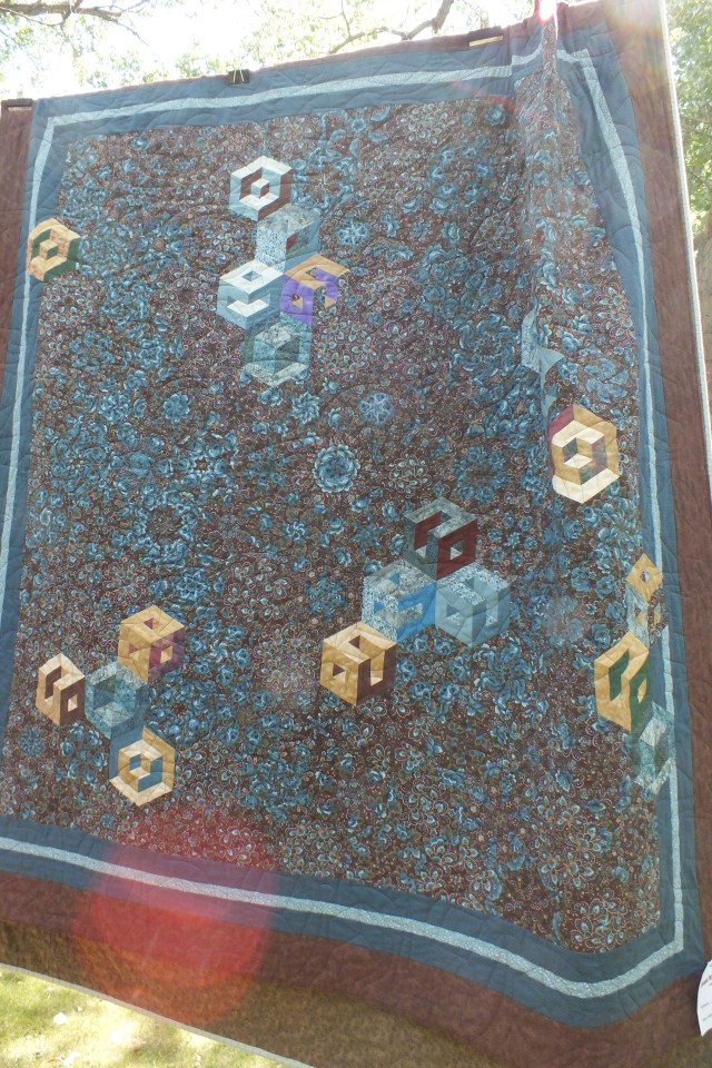 There was not a lot of custom quilting in evidence – it looked rather like someone with a long arm has been busy doing pantograms. Many had been quilted on home machines as well. Very nice work though. This one is about the best example of custom quilting – very good local design as well.