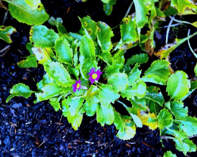 The summer has been so cool that the rhododendrons and this little primula think it must be spring again.