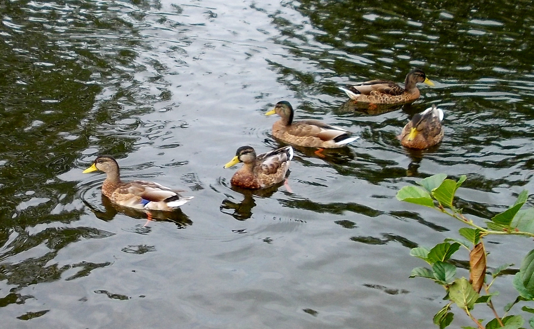 There was a pair of ducks – male and female – standing on the rock, and another couple in the water.  All four were quacking furiously at one another.  Suddenly, the drake on the rock jumped into the water and the other two scattered. He swam proudly back to perch beside his mate.