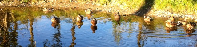 Gradually, as the weather has turn cooler and the days shorter, the drakes heads are becoming that wonderful iridescent green – their sides again clean and clear gray – the blue flash on their wings again bright and edged in brilliant white. What a transformation!  And I only saw it because I could watch them day by day, and was willing to notice.