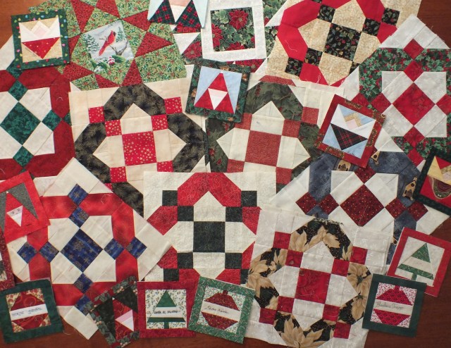 Canadianquiltswappers sponsored a monthly block lotto.  You made up to three blocks,  the pattern and colour chosen by the winner of the previous month.  I won the first time I entered – a lovely set of Log Cabin blocks, and then soon after I received a set of Contrary Wife blocks.  I made these into a quilt that I gave my daughter Lisa (see, they didn’t ALL turn into UFOs). This is an old photo, but I do want to prove I finished at least one.Alas, the 18 lovely Christmas blocks are still waiting – although I’m sure that this happened just before I moved to Kuwait…. what chance did I have???  Added in this photo are two orphan blocks and two sets of small swap blocks from Kuwait (27 in all).  I would like to find a way to incorporate all of these in one quilt.