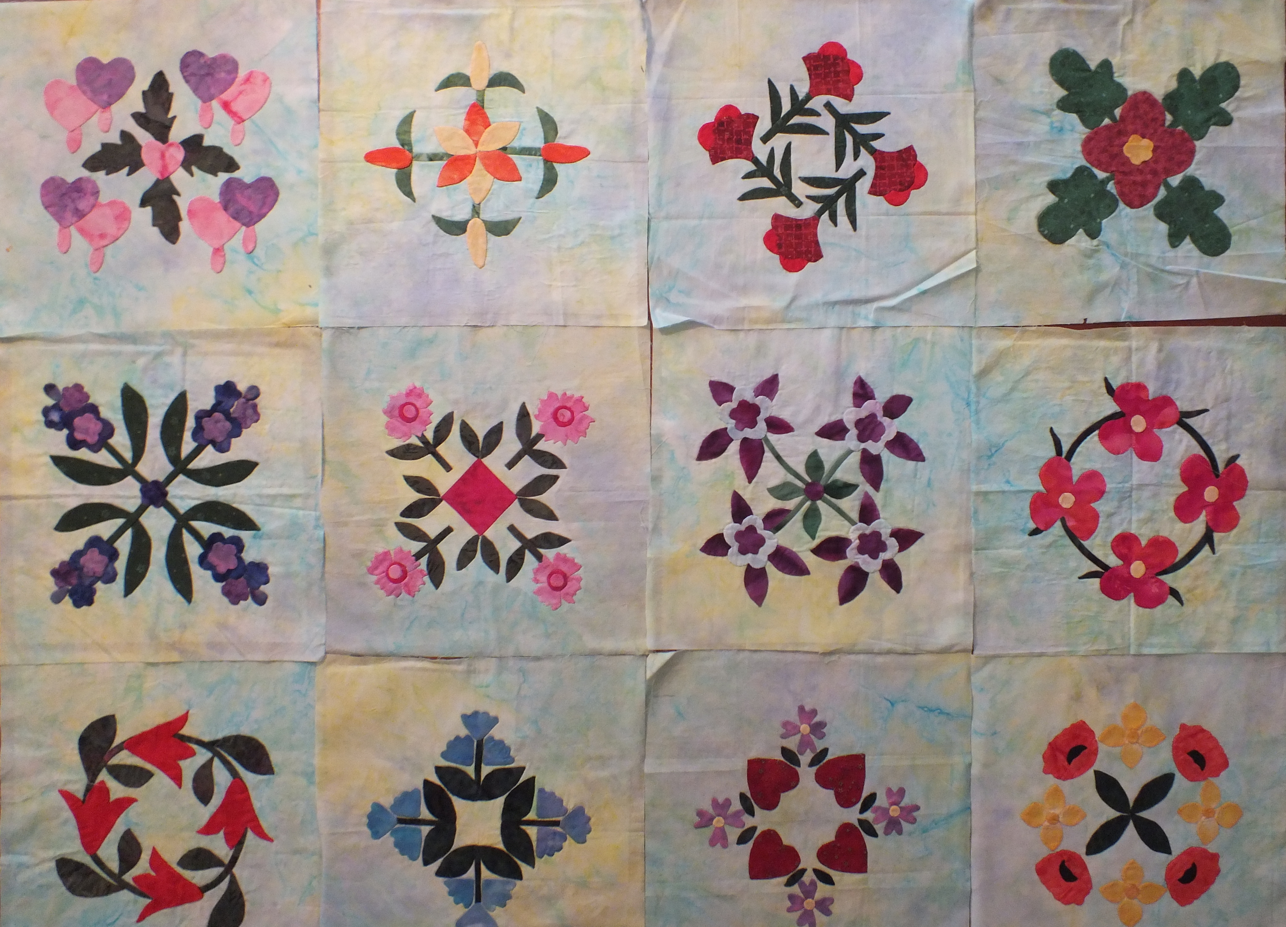 As I mentioned before, I wanted to learn to do needle-turn applique, and quickly realized that my fledgling skills would not stretch to doing the Twilight Garden blocks by Jeanne Rae Quilts.  I desperately wanted to learn the technique, so I did them in fabrics that couldn’t unravel – batiks.  They turned out really well, I think – but blocks they remained, as I didn’t want to set them in a 3 X 4 grid of sashing. And here they sit.