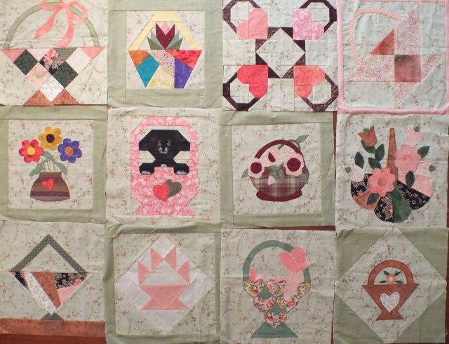 Before we left Canada to live in Kuwait, Lorraine and I went fabric shopping together in Fort St. John.  We found a lovely fabric that we both loved – so we bought what was left and shared it.  When I was leaving, we decided to use this shared fabric in a set of swapped basket blocks.  We did 6 each so we have 12 blocks ………