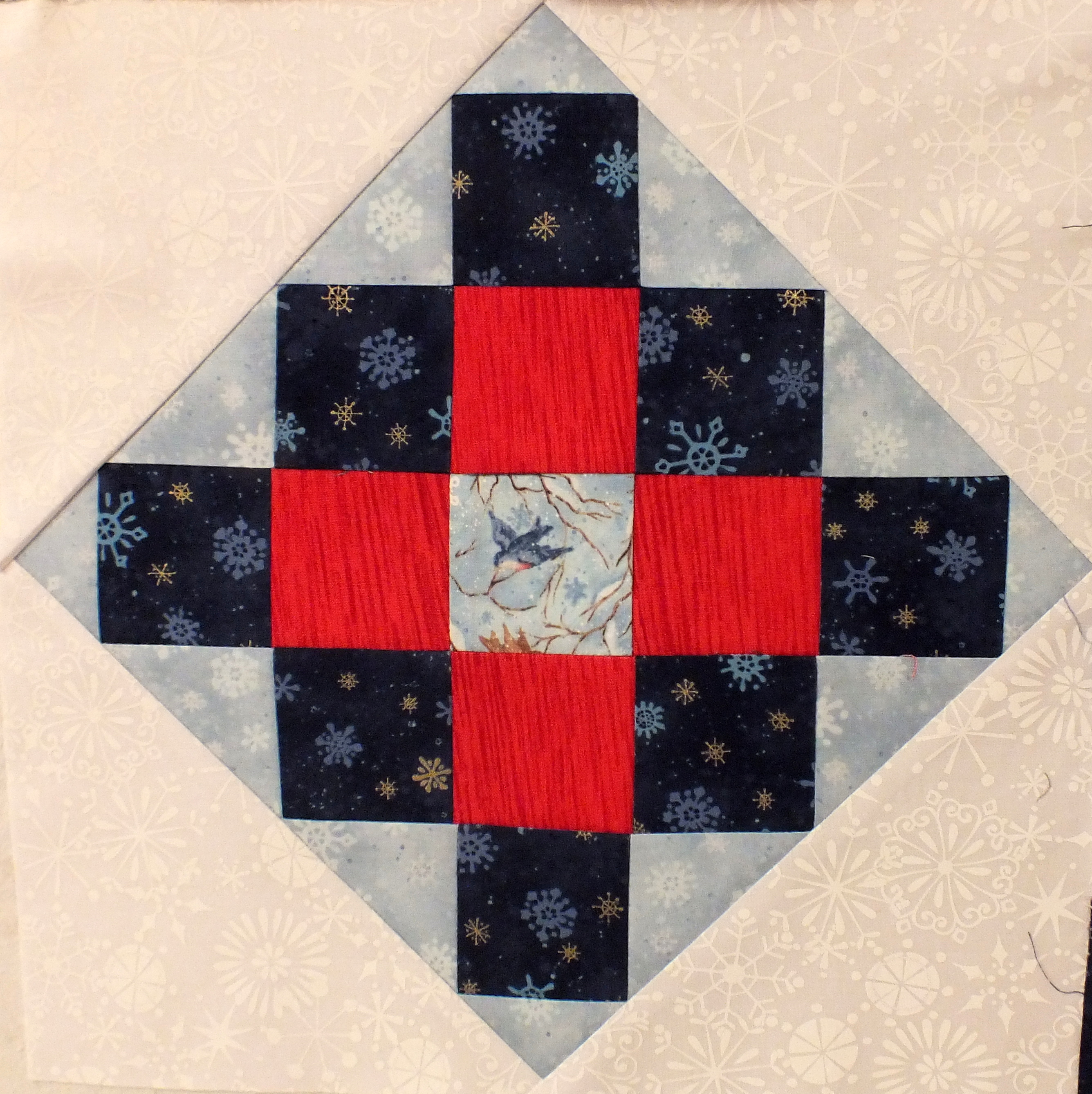 Next, I worked on the blocks for the local quilt group Block of the Month. First, I redid the August block, as I had realized that the inner square should not be the background colour. I like this much better with the pale blue around the centre.
