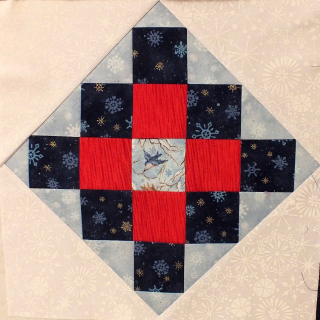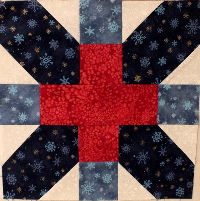 The block is too heavy for such dark colours. I will have to rethink this one and make another. It will need much lighter fabrics, or maybe a little extra piecing to lighten it to match the other three. I need to use the same red in all the blocks too – I’d hoped to be able to use different ones, but this, although it looks like frost, doesn’t have the vibrancy of the striped one.