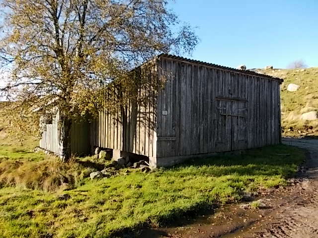 We walked along the path beside the lake for a while, and then it led us up to a pasture. There were old buildings there – not sure if they had been stables, but they looked to be used for storage now.