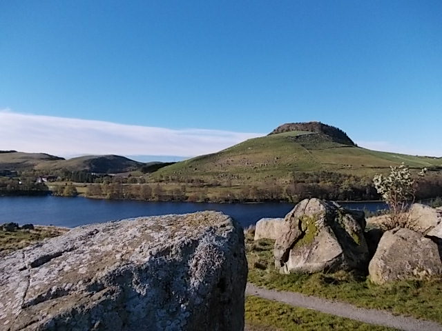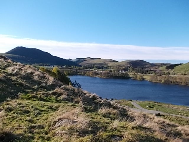 and looked down over the lake to this island. There were four swans swimming beside it – in the brilliant reflection of the sun, they were just shadows and very hard to see.