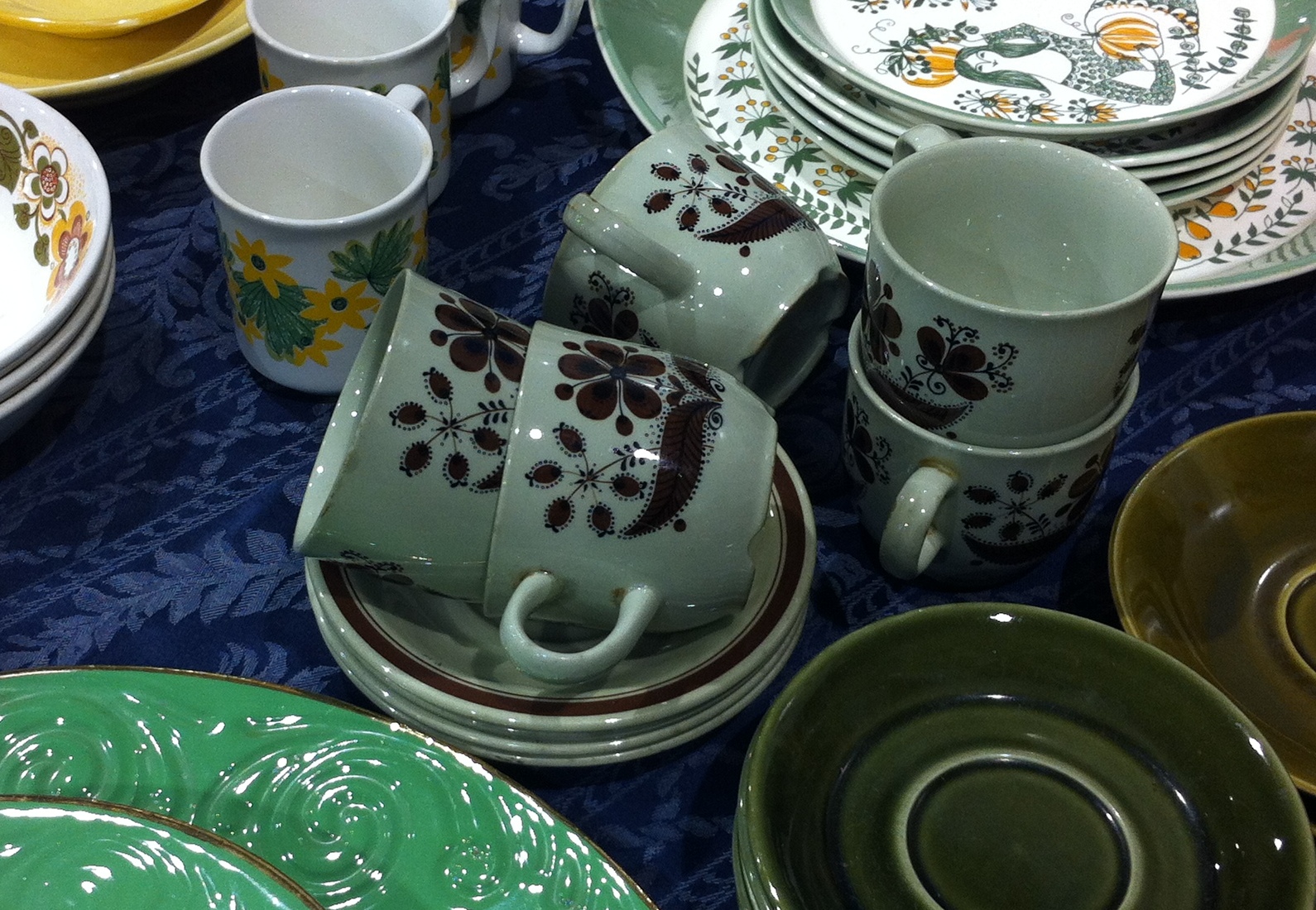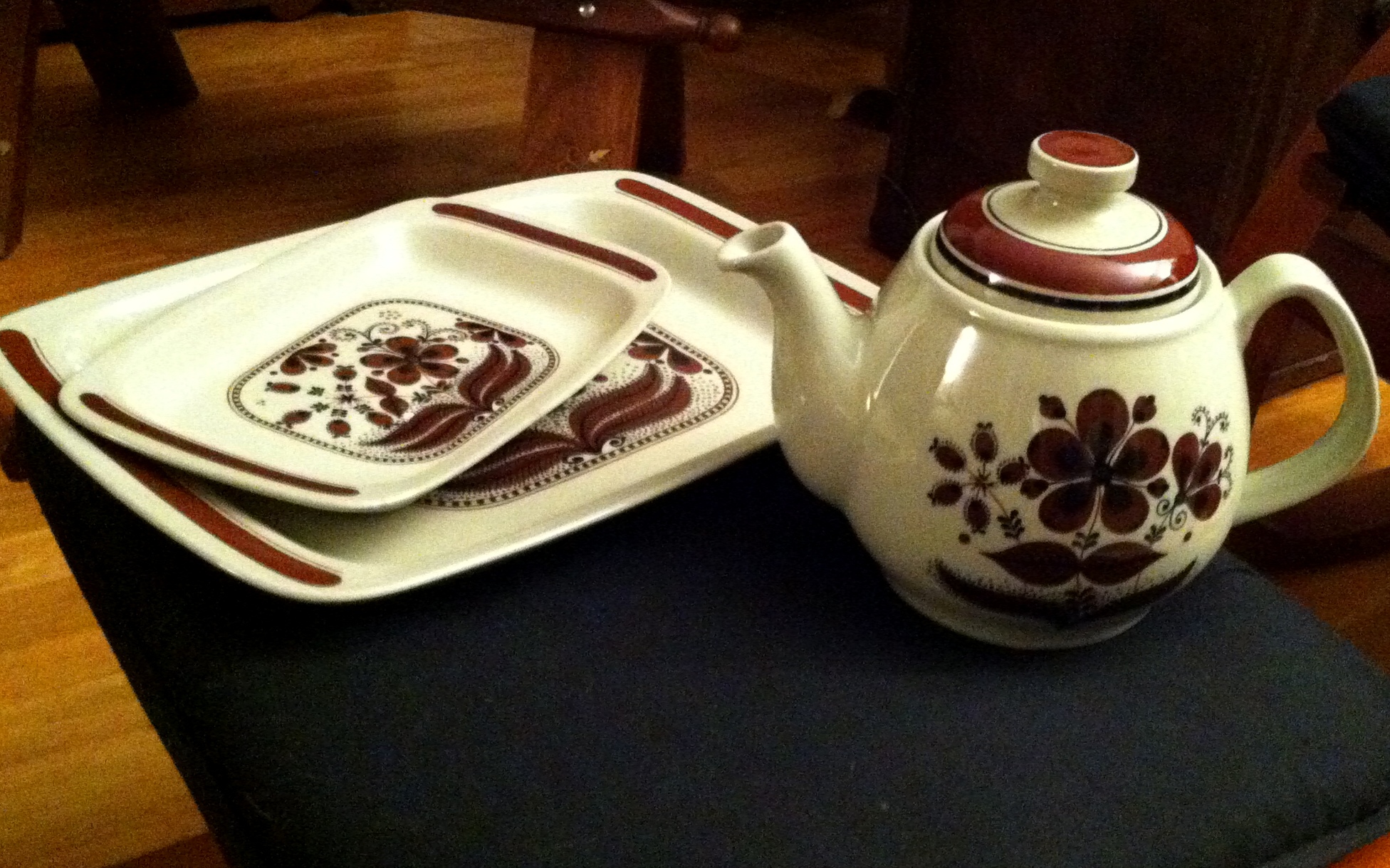some very old, and some not so. There were lots of Figgjo dishes, but no cream and sugar set. I did find a set of cups and saucers, but the background colour was darker and more gray-green than mine – I guess they made the pattern in two (or more?) colours.