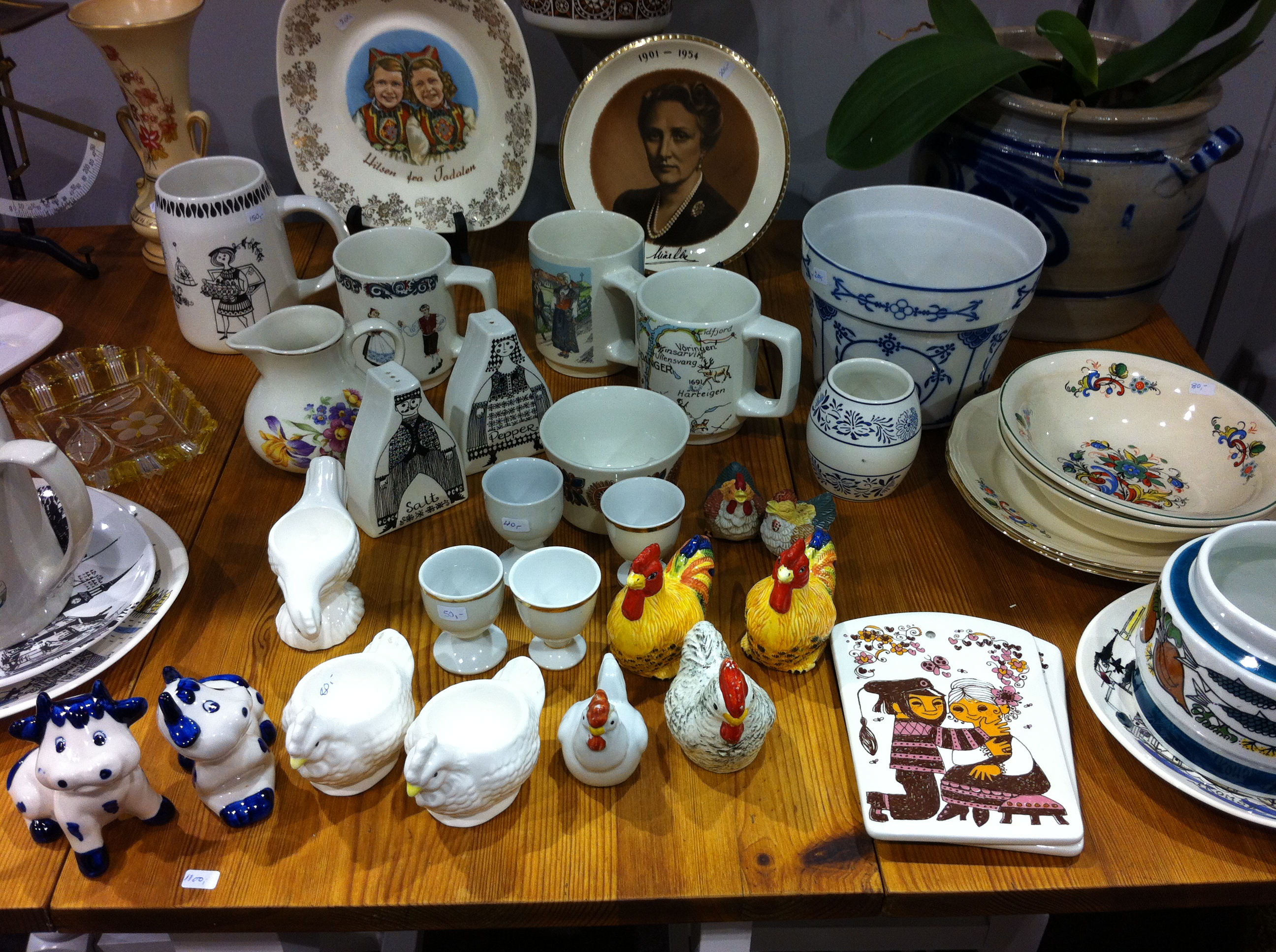 I had never been to the factory and boutique, so we were all in for a surprise. They have a wonderful assortment of dishes, in amazingly original shapes and designs. no sugar bowl for me, however. The “Hedde” design of my teapot was made between 1978 and 1981. How nice that we were headed next to an antique sale!