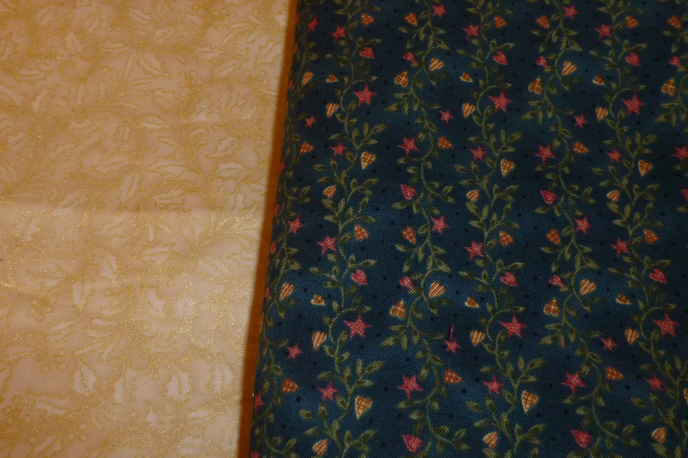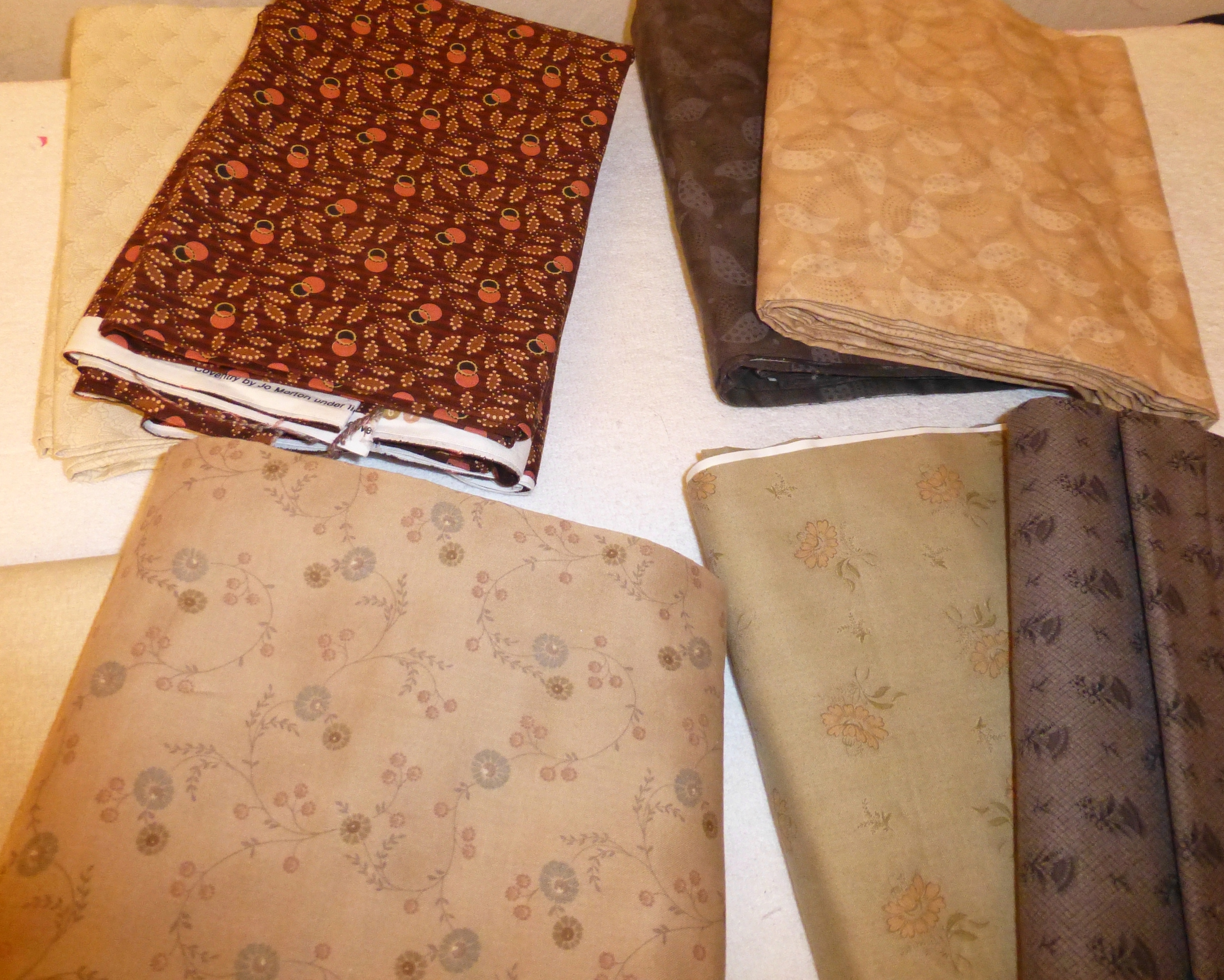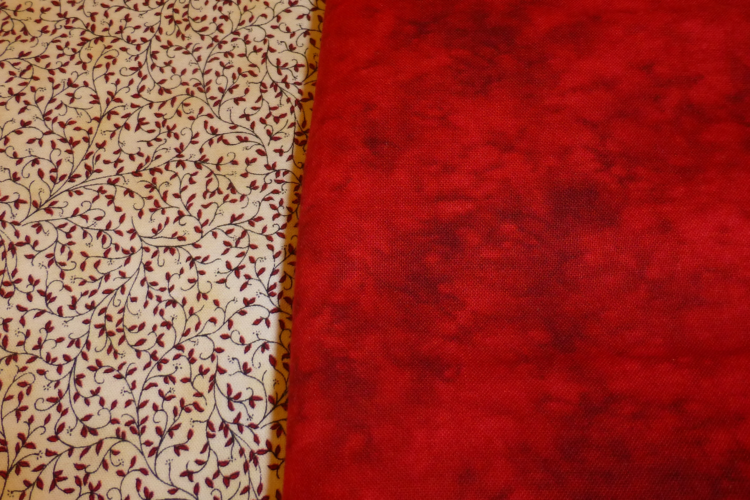 When I was first getting my sewing room in order for moving, I chose a green/red print that I’ve had a very long time and a pale yellow that had very slight variations in the colour…. but somehow, I wasn’t satisfied.  P1020669You see, there was something about the green print that I didn’t like, but I couldn’t put my finger on it.  So, as time drew closer to the unveiling of the first clue, I scoured the shelves again in search of something else.  I came up with several that I liked –P1020645