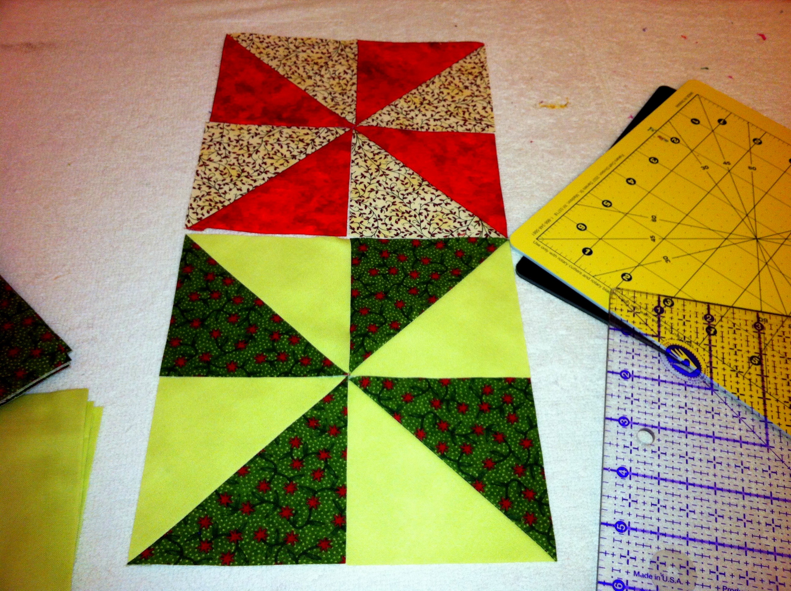 I guess it’s not hard to see where the contrast and life are, although the red would make a very pretty table cloth.  I think I may do a whole table cloth in the greens, and just one block in the red, maybe for a table topper.