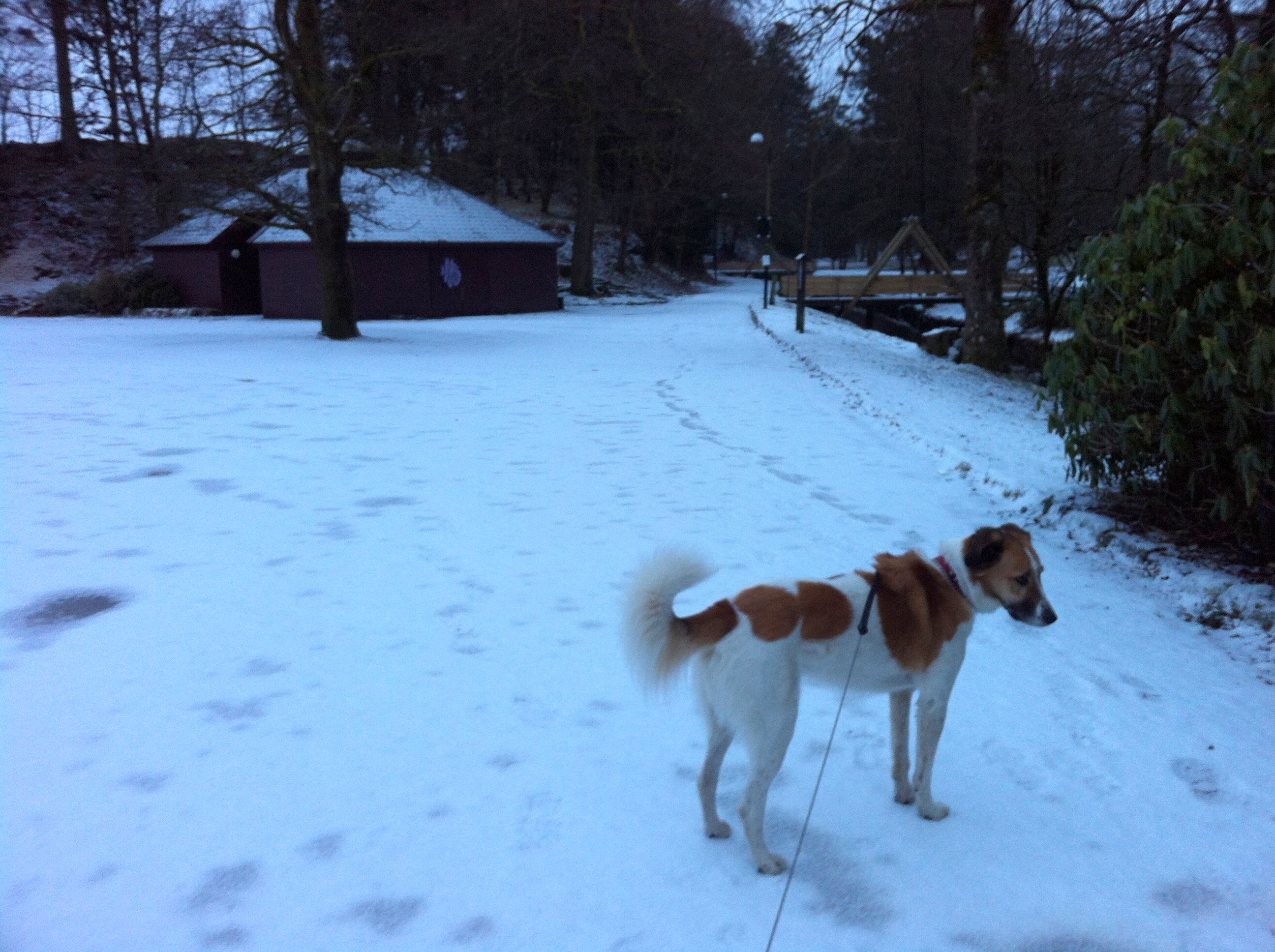 When Snoopy and I went out for out morning walk, the ground was crunchy, and it wasn’t long before we were peering through a haze of snowflakes. At 9 am it was only beginning to get light outside, and so my photos all have a blue, early morning cast to them.  I hate going out in the dark in the morning – bad enough that it’s dark by 5 pm and our evening walk is necessarily under the lights. Snoopy was glad to be out early, as I’m afraid all too often I sleep in and he sits with his legs crossed at the front door, waiting for me to take him out. We weren’t the first ones out, but traffic is light in the park on Saturday mornings.