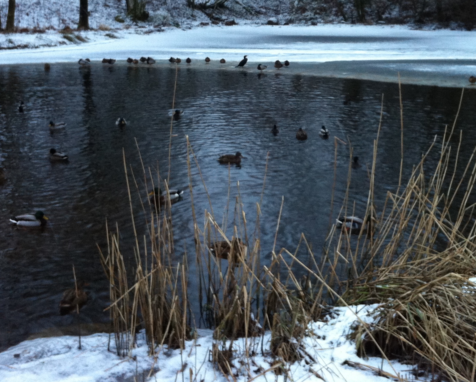 The duck pond was about half-frozen over, but the ducks and lone cormorant seemed to enjoy having the ice to perch on out of the water.IMG_5689