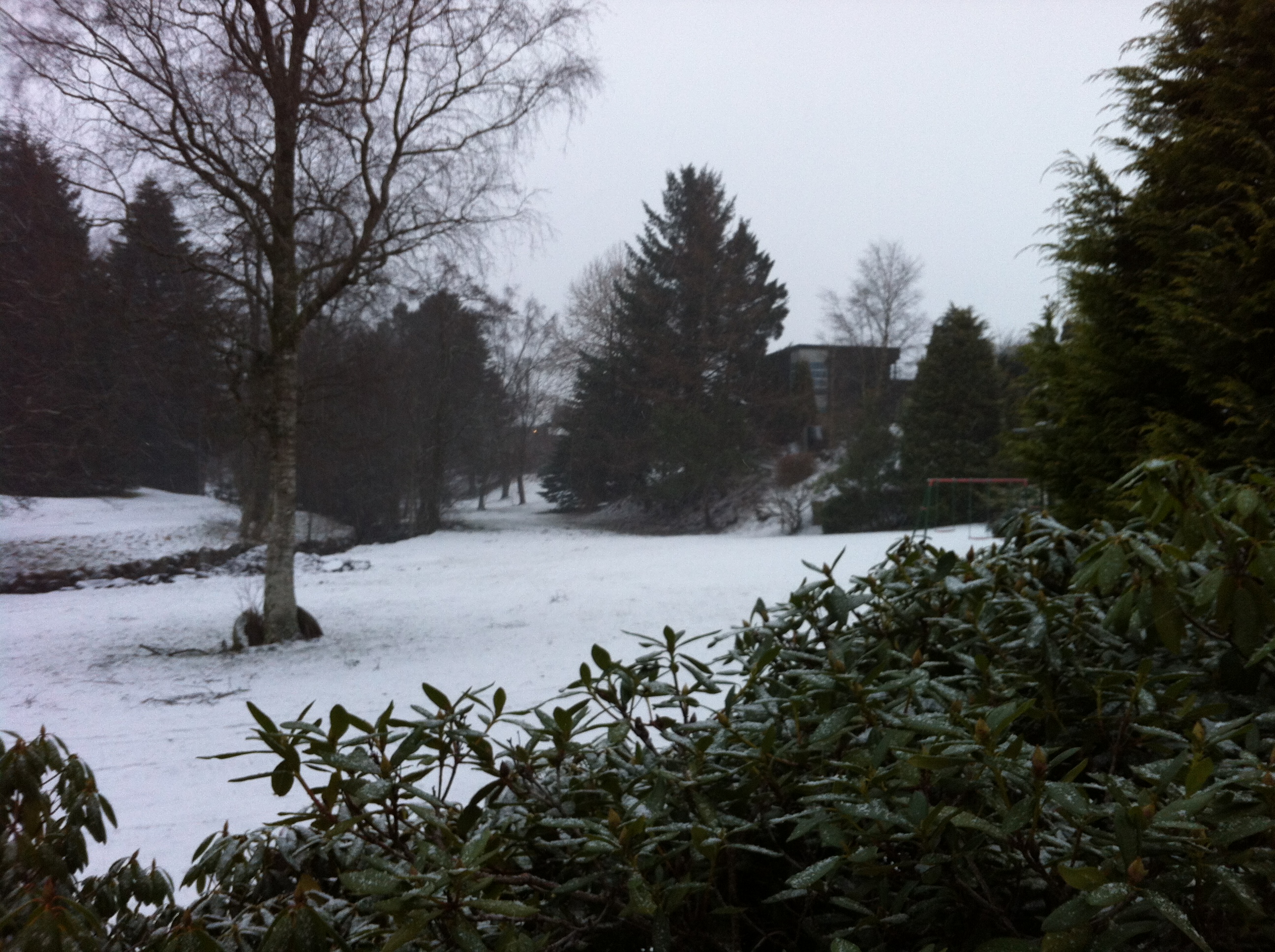 The snow was coming down fairly heavy by now, sitting on the rhododendron leaves where only a few days ago they were covered with frost.IMG_5694