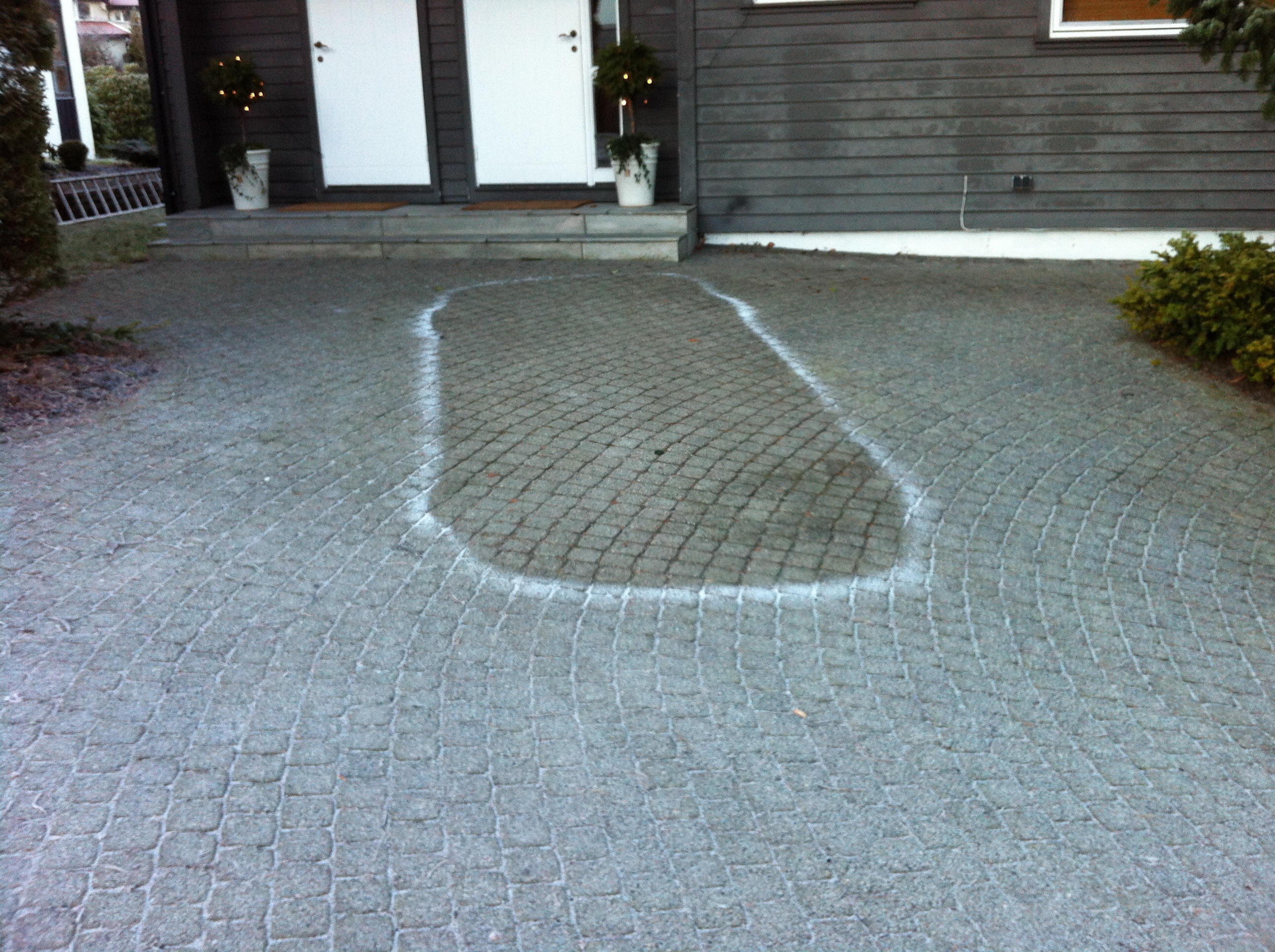 As we wandered down the street, we came to our neighbours’ driveway. they had already left for work, but I could see where they had been parked. It reminded me of the chalk line they draw around a dead body before they remove it on all the mystery programs on TV.