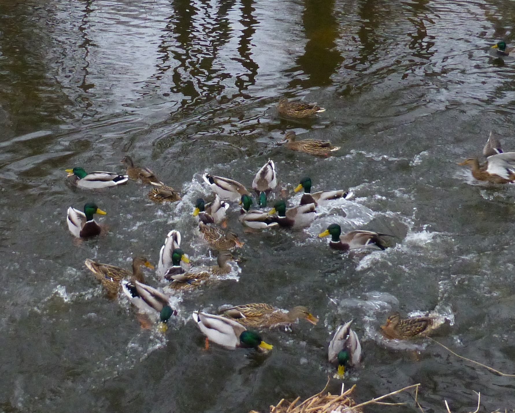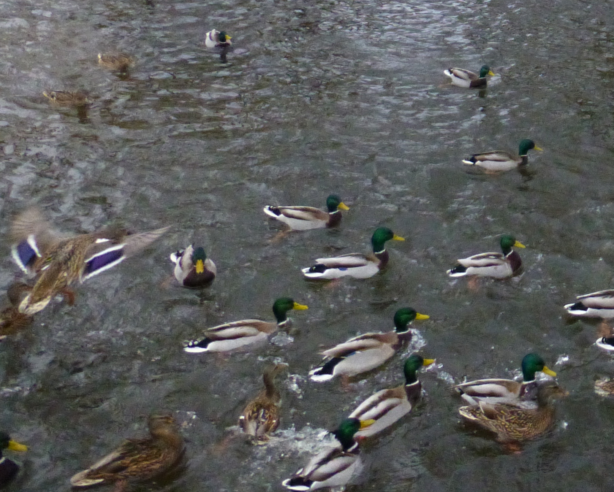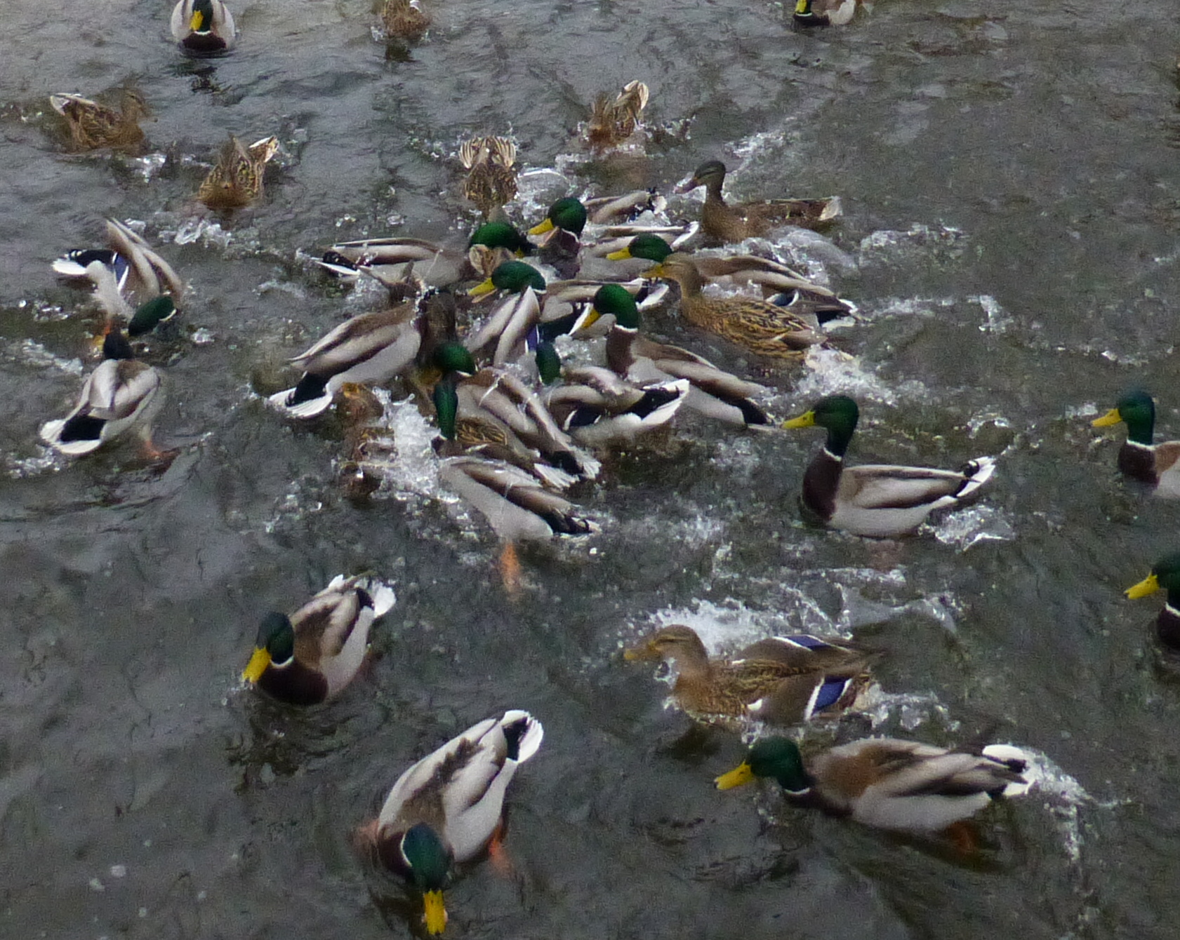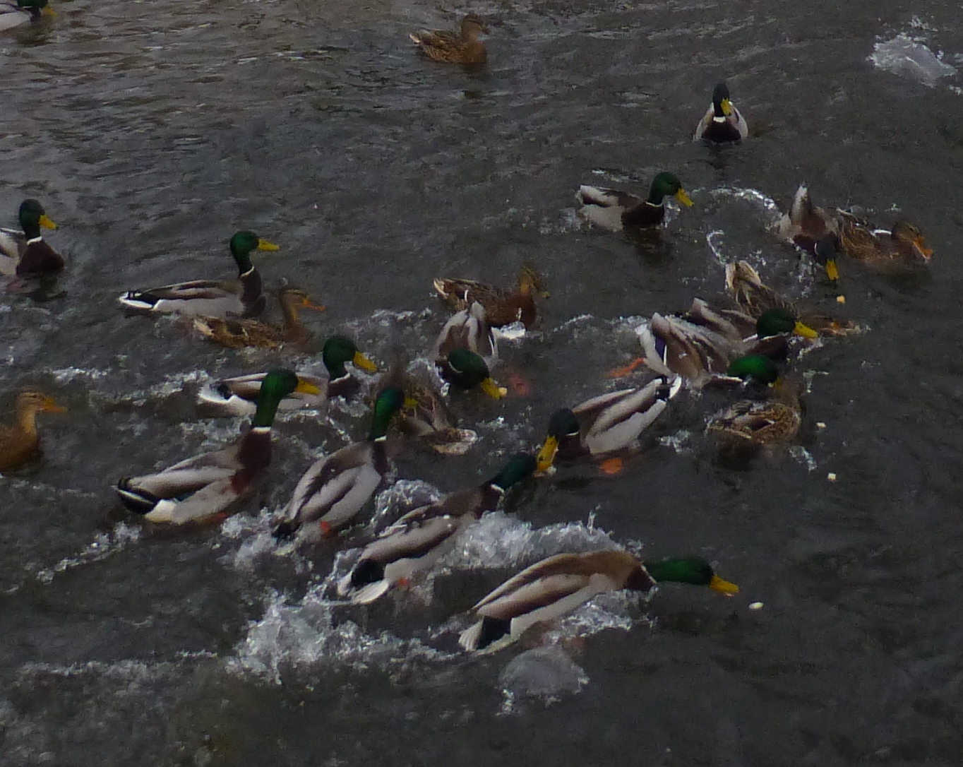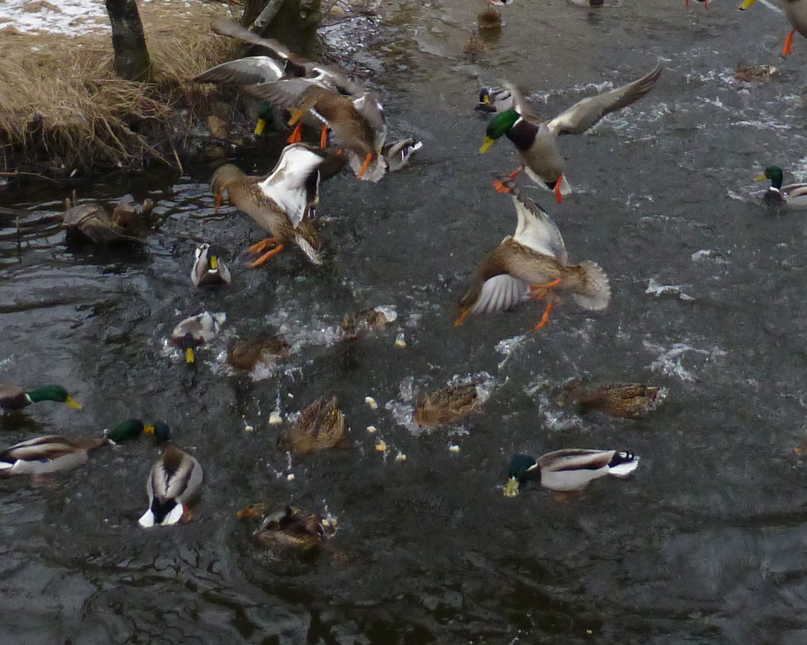 The following day I can armed with half a loaf of bread, and my camera.Tying Snoopy to a light post, i proceeded to throw out a handful of bread crumbs, and then try to snap a photo of the ducks as they flew to where I was P1020714 P1020715and monkey-piled in the water for the food. P1020725 P1020896I walked a bit farther upstream, and did it again. P1020949 P1020938It’s hard to hold a camera steady when you are laughing as hard as I was.