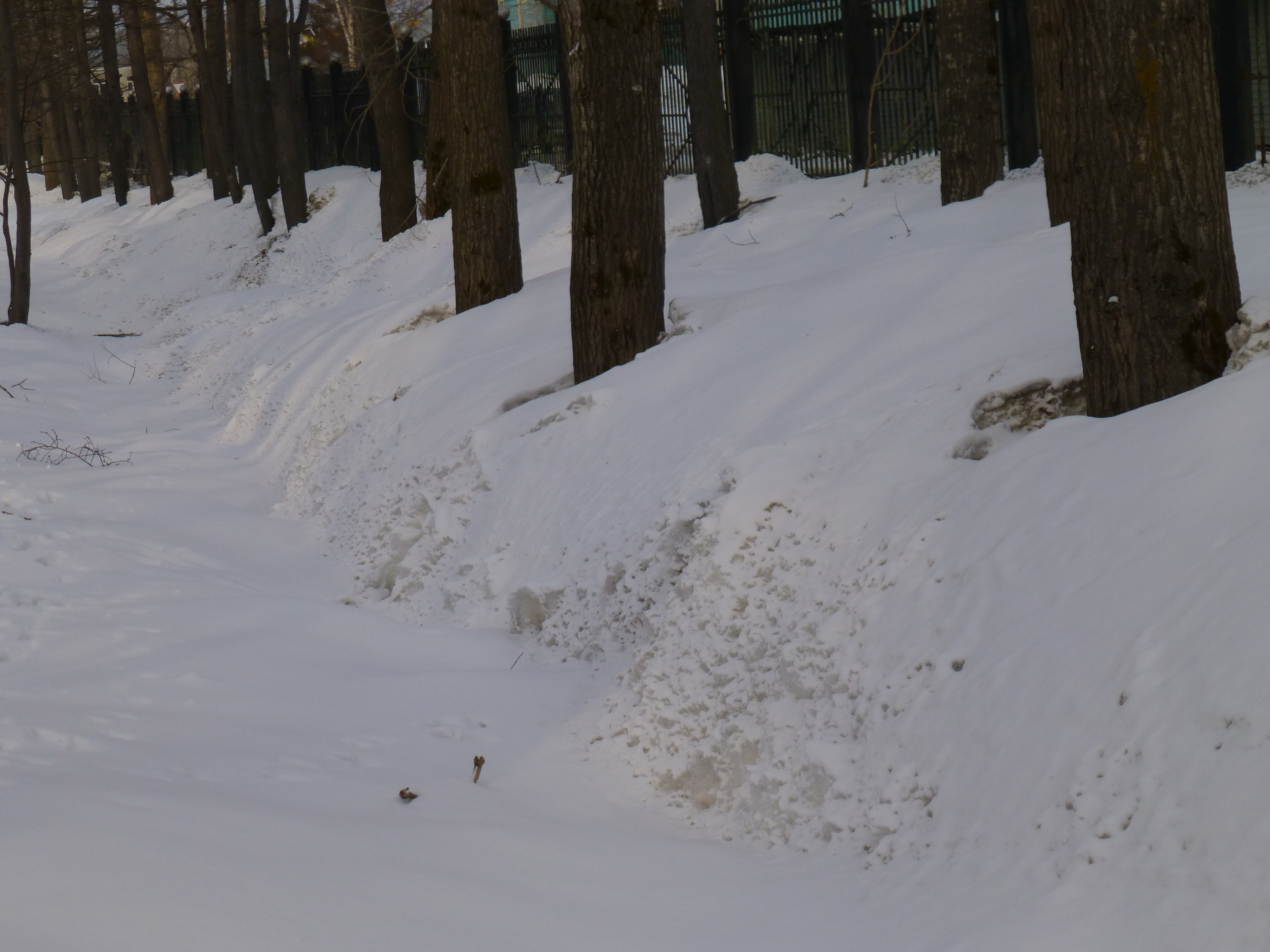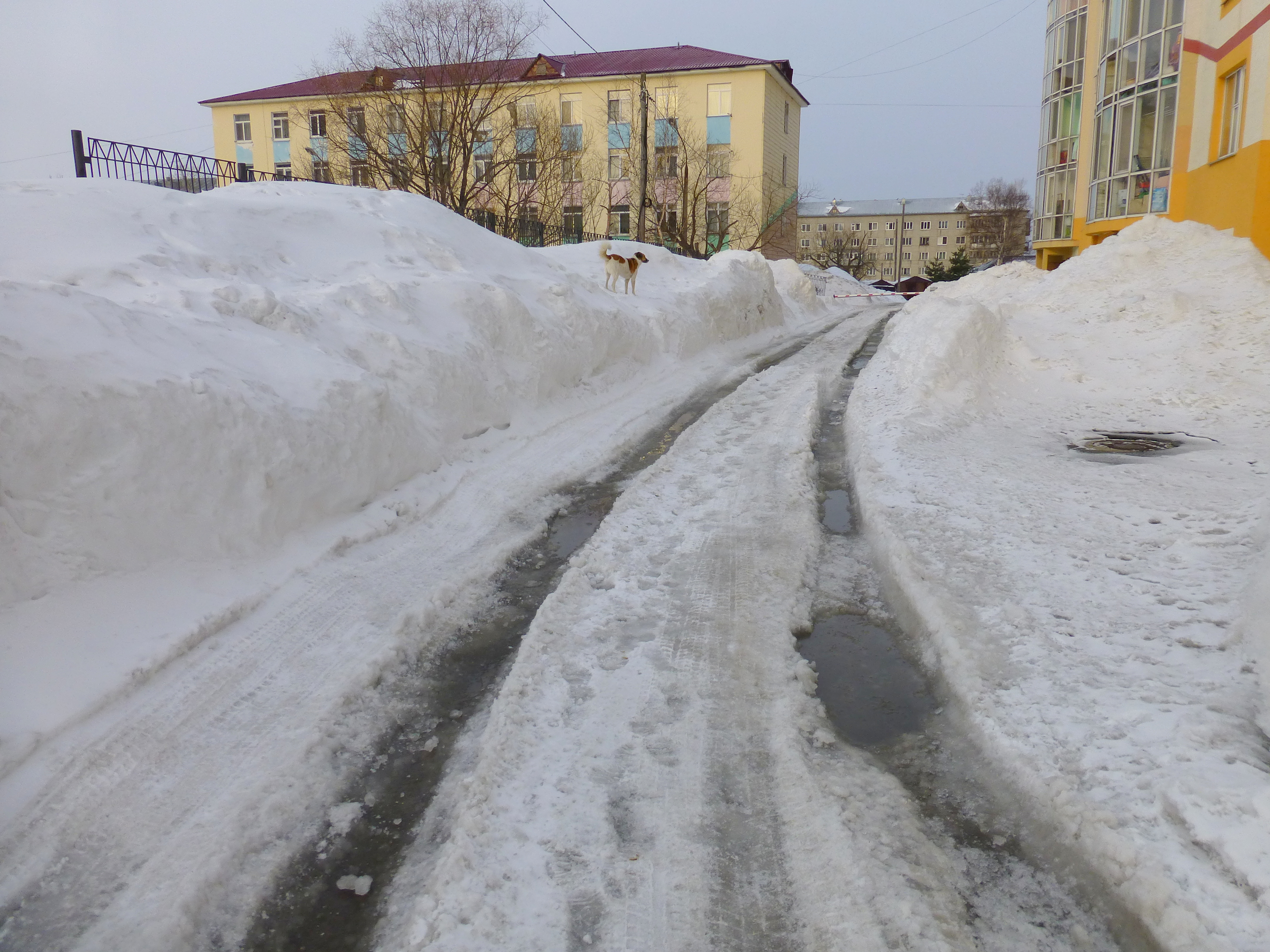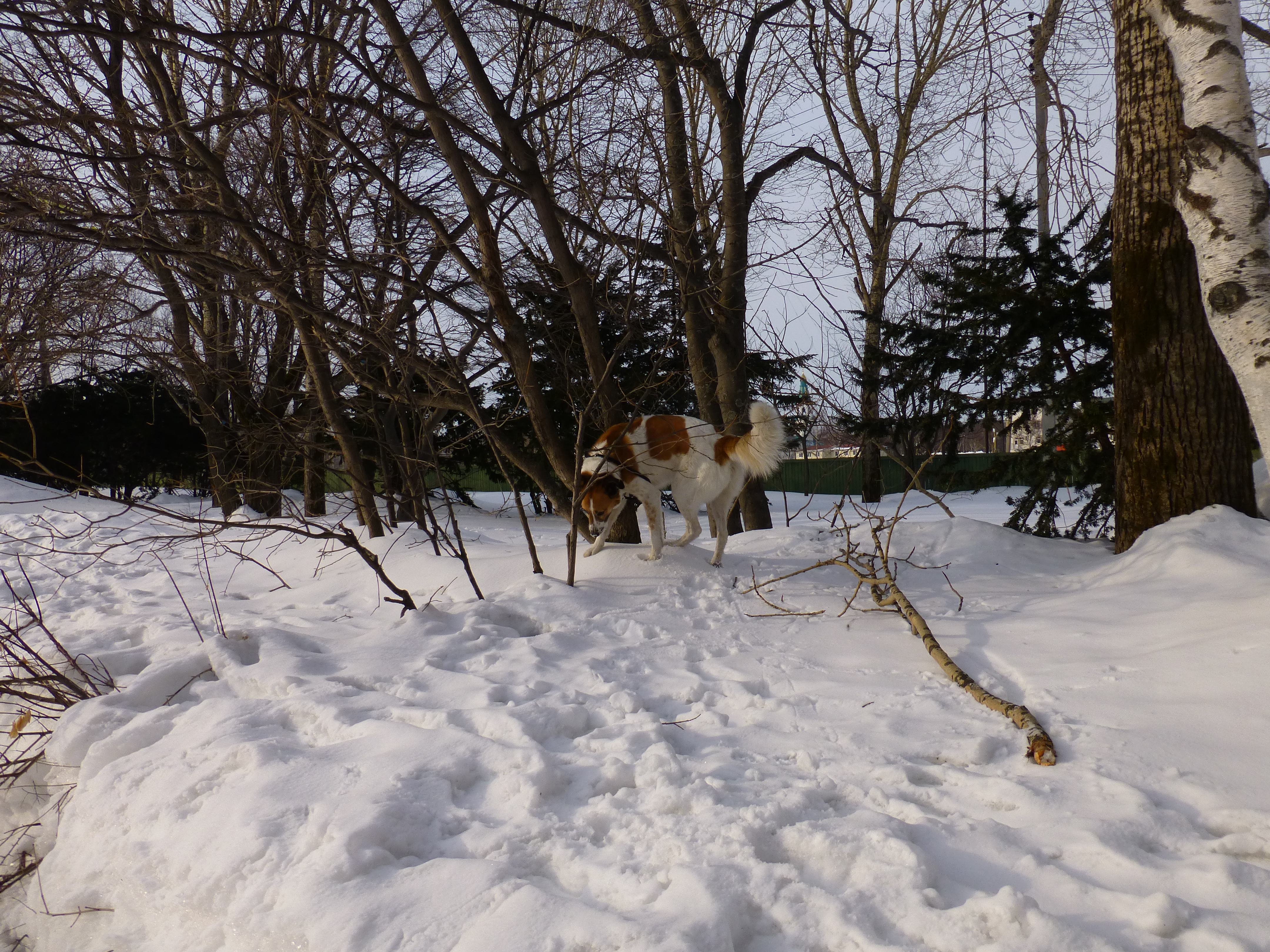 This morning, Snoopy and I had a wonderful walk in the park. The air was mild, the sun shone – not brilliantly, but it was there, promising more melting later in the day. There is water standing in the road behind the apartment.